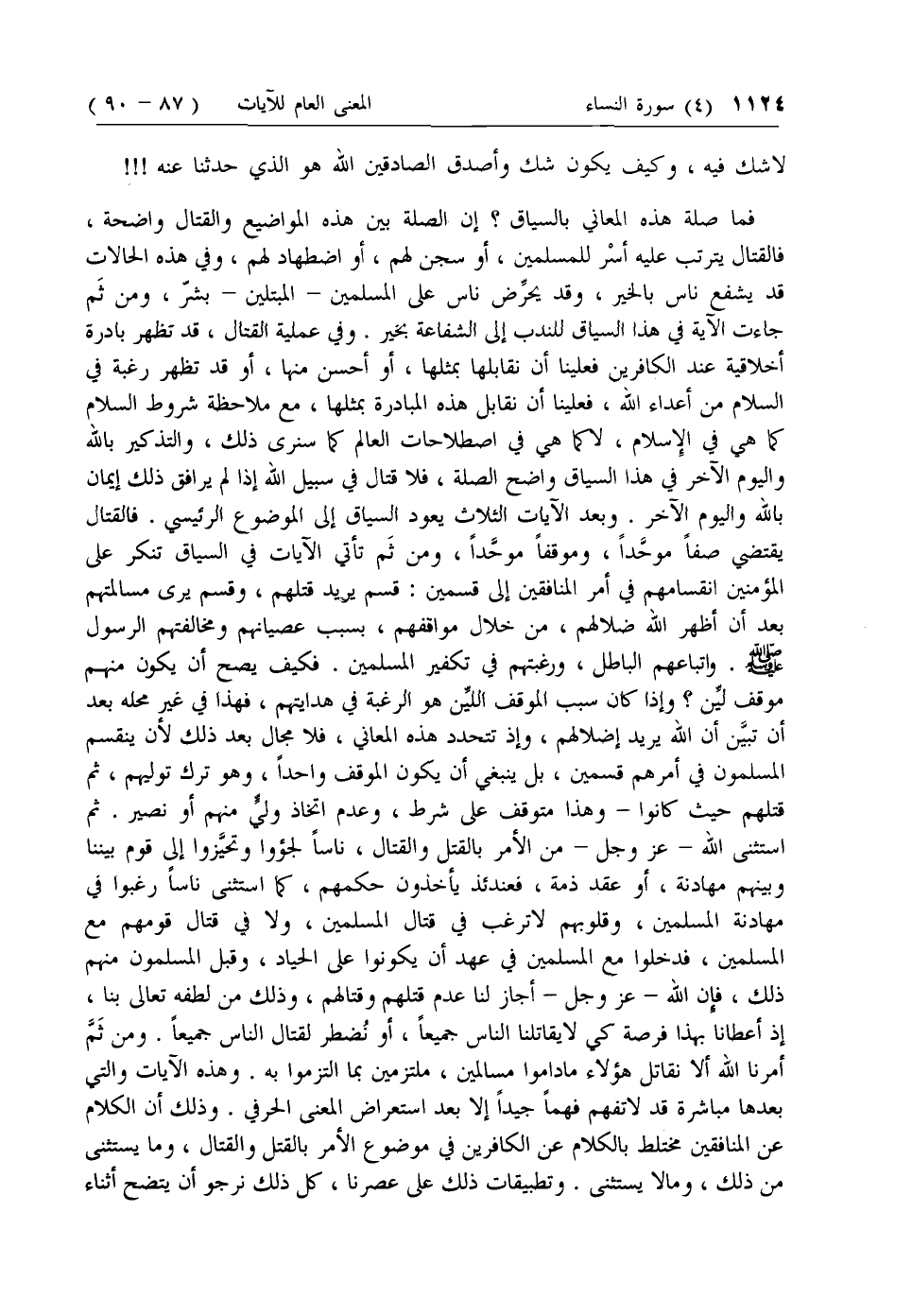 فما صلة هذه المعاني بالسياق؟ إن الصلة بين هذه المواضيع والقتال واضحة، فالقتال يترتب عليه أسر للمسلمين، أو سجن لهم، أو اضطهاد لهم، وفي هذه الحالات قد يشفع ناس بالخير، وقد يحرض ناس على المسلمين- المبتلين- بشر، ومن ثم جاءت الآية في هذا السياق للندب إلى الشفاعة بخير. وفي عملية القتال، قد تظهر بادرة أخلاقية عند الكافرين فعلينا أن نقابلها بمثلها، أو أحسن منها، أو قد تظهر رغبة في السلام من أعداء الله، فعلينا أن نقابل هذه المبادرة بمثلها، مع ملاحظة شروط السلام كما هي في الإسلام، لا كما هي في اصطلاحات العالم كما سنرى ذلك، والتذكير بالله واليوم الآخر في هذا السياق واضح الصلة، فلا قتال في سبيل الله إذا لم يرافق ذلك إيمان بالله واليوم الآخر. وبعد الآيات الثلاث يعود السياق إلى الموضوع الرئيسي. فالقتال يقتضي صفا موحدا، وموقفا موحدا، ومن ثم تأتي الآيات في السياق تنكر على المؤمنين انقسامهم في أمر المنافقين إلى قسمين: قسم يريد قتلهم، وقسم يرى مسالمتهم بعد أن أظهر الله ضلالهم، من خلال مواقفهم، بسبب عصيانهم ومخالفتهم الرسول صلى الله عليه وسلم. واتباعهم الباطل، ورغبتهم في تكفير المسلمين. فكيف يصح أن يكون منهم موقف لين؟ وإذا كان سبب الموقف اللين هو الرغبة في هدايتهم، فهذا في غير محله بعد أن تبين أن الله يريد إضلالهم، وإذ تتحدد هذه المعاني، فلا مجال بعد ذلك لأن ينقسم المسلمون في أمرهم قسمين، بل ينبغي أن يكون الموقف واحدا، وهو ترك توليهم، ثم قتلهم حيث كانوا- وهذا متوقف على شرط، وعدم اتخاذ ولي منهم أو نصير. ثم استثنى الله- عزّ وجل- من الأمر بالقتل والقتال، ناسا لجئوا وتحيزوا إلى قوم بيننا وبينهم مهادنة، أو عقد ذمة، فعندئذ يأخذون حكمهم، كما استثنى ناسا رغبوا في مهادنة المسلمين، وقلوبهم لا ترغب في قتال المسلمين، ولا في قتال قومهم مع المسلمين، فدخلوا مع المسلمين في عهد أن يكونوا على الحياد، وقبل المسلمون منهم ذلك، فإن الله- عزّ وجل- أجاز لنا عدم قتلهم وقتالهم، وذلك من لطفه تعالى بنا، إذ أعطانا بهذا فرصة كيلا يقاتلنا الناس جميعا، أو نضطر لقتال الناس جميعا. ومن ثم أمرنا الله ألا نقاتل هؤلاء ما داموا مسالمين، ملتزمين بما التزموا به. وهذه الآيات والتي بعدها مباشرة قد لا تفهم فهما جيدا إلا بعد استعراض المعنى الحرفي. وذلك أن الكلام عن المنافقين مختلط بالكلام عن الكافرين في موضوع الأمر بالقتل والقتال، وما يستثنى من ذلك، وما لا يستثنى. وتطبيقات ذلك على عصرنا، كل ذلك نرجو أن يتضح أثناء