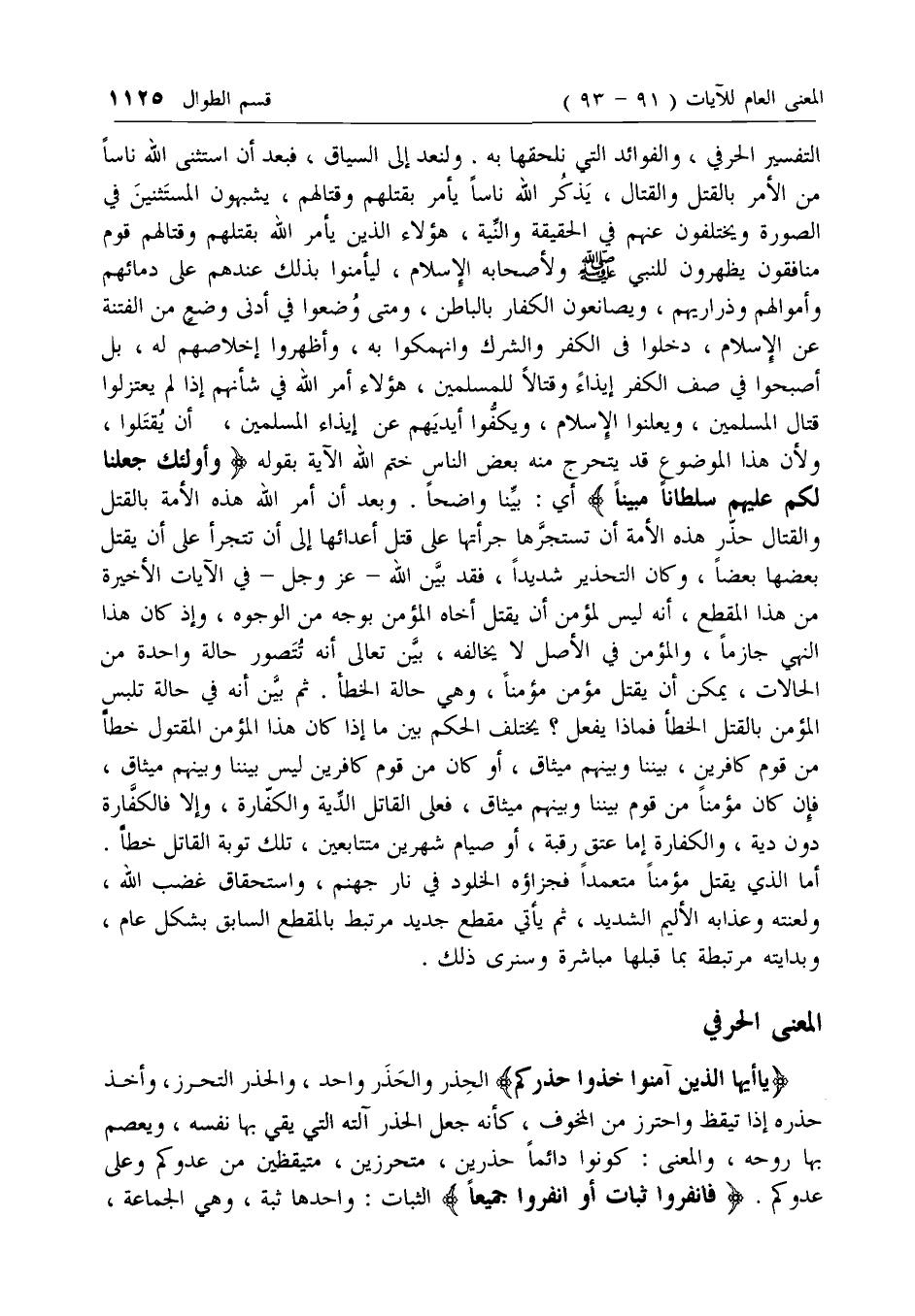 التفسير الحرفي، والفوائد التي نلحقها به. ولنعد إلى السياق، فبعد أن استثنى الله ناسا من الأمر بالقتل والقتال، يذكر الله ناسا يأمر بقتلهم وقتالهم، يشبهون المستثنين في الصورة ويختلفون عنهم في الحقيقة والنية، هؤلاء الذين يأمر الله بقتلهم وقتالهم قوم منافقون يظهرون للنبي صلى الله عليه وسلم ولأصحابه الإسلام، ليأمنوا بذلك عندهم على دمائهم وأموالهم وذراريهم، ويصانعون الكفار بالباطن، ومتى وضعوا في أدنى وضع من الفتنة عن الإسلام، دخلوا فى الكفر والشرك وانهمكوا به، وأظهروا إخلاصهم له، بل أصبحوا في صف الكفر إيذاء وقتالا للمسلمين، هؤلاء أمر الله في شأنهم إذا لم يعتزلوا قتال المسلمين، ويعلنوا الإسلام، ويكفوا أيديهم عن إيذاء المسلمين، أن يقتلوا، ولأن هذا الموضوع قد يتحرج منه بعض الناس ختم الله الآية بقوله وَأُولئِكُمْ جَعَلْنا لَكُمْ عَلَيْهِمْ سُلْطاناً مُبِيناً أي: بينا واضحا. وبعد أن أمر الله هذه الأمة بالقتل والقتال حذر هذه الأمة أن تستجرها جرأتها على قتل أعدائها إلى أن تتجرأ على أن يقتل بعضها بعضا، وكان التحذير شديدا، فقد بين الله- عزّ وجل- في الآيات الأخيرة من هذا المقطع، أنه ليس لمؤمن أن يقتل أخاه المؤمن بوجه من الوجوه، وإذ كان هذا النهي جازما، والمؤمن في الأصل لا يخالفه، بين تعالى أنه تتصور حالة واحدة من الحالات، يمكن أن يقتل مؤمن مؤمنا، وهي حالة الخطأ. ثم بين أنه في حالة تلبس المؤمن بالقتل الخطأ فماذا يفعل؟ يختلف الحكم بين ما إذا كان هذا المؤمن المقتول خطا من قوم كافرين، بيننا وبينهم ميثاق، أو كان من قوم كافرين ليس بيننا وبينهم ميثاق، فإن كان مؤمنا من قوم بيننا وبينهم ميثاق، فعلى القاتل الدية والكفارة، وإلا فالكفارة دون دية، والكفارة إما عتق رقبة، أو صيام شهرين متتابعين، تلك توبة القاتل خطا.