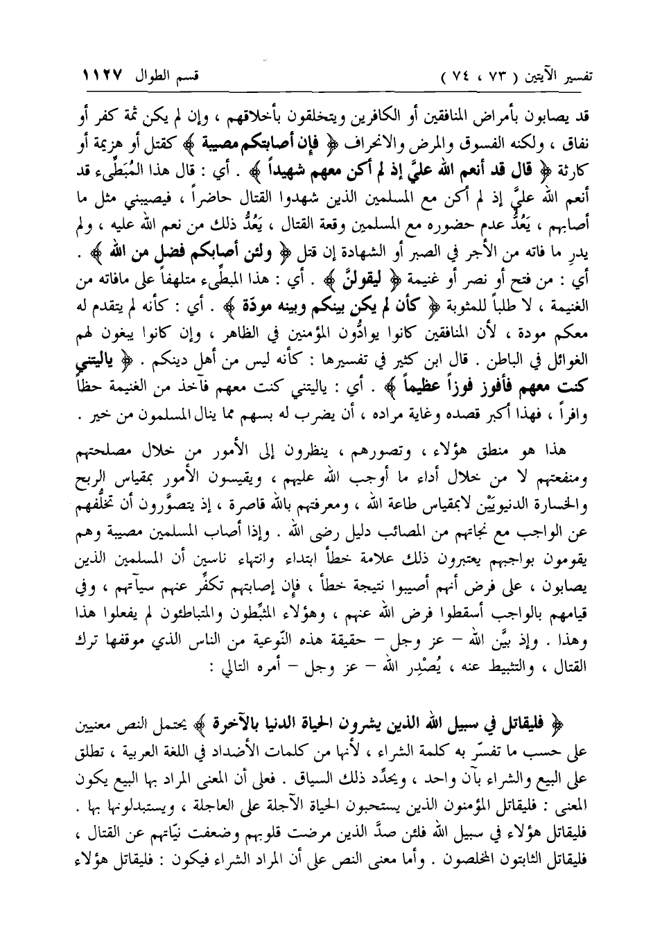 قد يصابون بأمراض المنافقين أو الكافرين ويتخلقون بأخلاقهم، وإن لم يكن ثمة كفر أو نفاق، ولكنه الفسوق والمرض والانحراف فَإِنْ أَصابَتْكُمْ مُصِيبَةٌ كقتل أو هزيمة أو كارثة قالَ قَدْ أَنْعَمَ اللَّهُ عَلَيَّ إِذْ لَمْ أَكُنْ مَعَهُمْ شَهِيداً. أي: قال هذا المبطئ قد أنعم الله علي إذ لم أكن مع المسلمين الذين شهدوا القتال حاضرا، فيصيبني مثل ما أصابهم، يعد عدم حضوره مع المسلمين وقعة القتال، يعد ذلك من نعم الله عليه، ولم يدر ما فاته من الأجر في الصبر أو الشهادة إن قتل