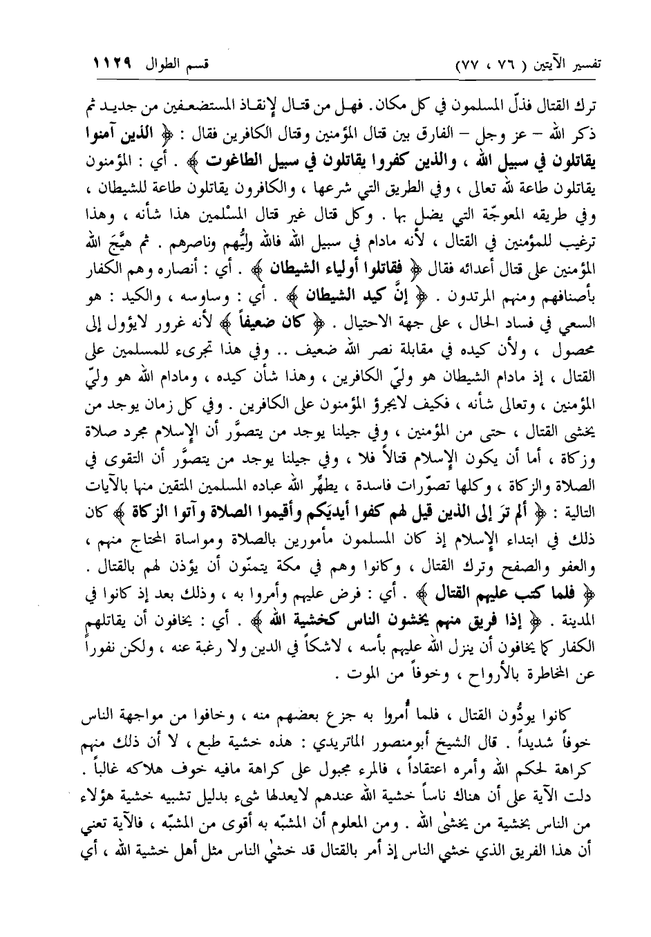 ثم ذكر الله- عزّ وجل- الفارق بين قتال المؤمنين وقتال الكافرين فقال: الَّذِينَ آمَنُوا يُقاتِلُونَ فِي سَبِيلِ اللَّهِ، وَالَّذِينَ كَفَرُوا يُقاتِلُونَ فِي سَبِيلِ الطَّاغُوتِ. أي: المؤمنون يقاتلون طاعة لله تعالى، وفي الطريق التي شرعها، والكافرون يقاتلون طاعة للشيطان، وفي طريقه المعوجة التي يضل بها. وكل قتال غير قتال المسلمين هذا شأنه، وهذا ترغيب للمؤمنين في القتال، لأنه ما دام في سبيل الله فالله وليهم وناصرهم. ثم هيج الله المؤمنين على قتال أعدائه فقال فَقاتِلُوا أَوْلِياءَ الشَّيْطانِ. أي: أنصاره وهم الكفار بأصنافهم ومنهم المرتدون. إِنَّ كَيْدَ الشَّيْطانِ. أي: وساوسه، والكيد: هو السعي في فساد الحال، على جهة الاحتيال. كانَ ضَعِيفاً لأنه غرور لا يؤول إلى محصول، ولأن كيده في مقابلة نصر الله ضعيف .. وفي هذا تجريء للمسلمين على القتال، إذ ما دام الشيطان هو ولي الكافرين، وهذا شأن كيده، وما دام الله هو ولي المؤمنين، وتعالى شأنه، فكيف لا يجرؤ المؤمنون على الكافرين. وفي كل زمان يوجد من يخشى القتال، حتى من المؤمنين، وفي جيلنا يوجد من يتصور أن الإسلام مجرد صلاة وزكاة، أما أن يكون الإسلام قتالا فلا، وفي جيلنا يوجد من يتصور أن التقوى في الصلاة والزكاة، وكلها تصورات فاسدة، يطهر الله عباده المسلمين المتقين منها بالآيات التالية: