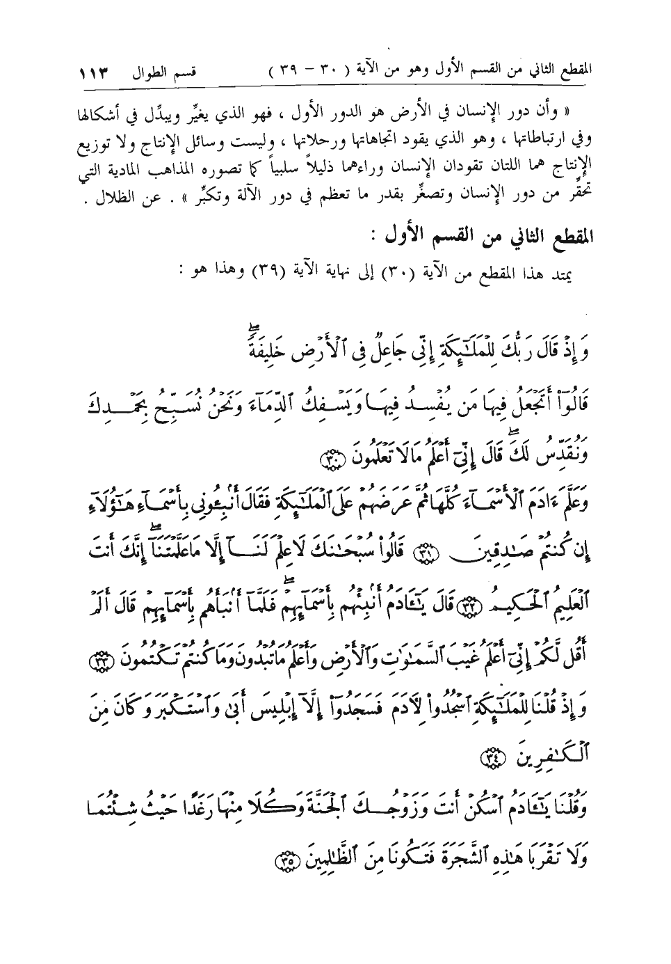وَإِذْ قالَ رَبُّكَ لِلْمَلائِكَةِ إِنِّي جاعِلٌ فِي الْأَرْضِ خَلِيفَةً قالُوا أَتَجْعَلُ فِيها مَنْ يُفْسِدُ فِيها وَيَسْفِكُ الدِّماءَ وَنَحْنُ نُسَبِّحُ بِحَمْدِكَ وَنُقَدِّسُ لَكَ قالَ إِنِّي أَعْلَمُ ما لا تَعْلَمُونَ (30) وَعَلَّمَ آدَمَ الْأَسْماءَ كُلَّها ثُمَّ عَرَضَهُمْ عَلَى الْمَلائِكَةِ فَقالَ أَنْبِئُونِي بِأَسْماءِ هؤُلاءِ إِنْ كُنْتُمْ صادِقِينَ (31) قالُوا سُبْحانَكَ لا عِلْمَ لَنا إِلاَّ ما عَلَّمْتَنا إِنَّكَ أَنْتَ الْعَلِيمُ الْحَكِيمُ (32) قالَ يا آدَمُ أَنْبِئْهُمْ بِأَسْمائِهِمْ فَلَمَّا أَنْبَأَهُمْ بِأَسْمائِهِمْ قالَ أَلَمْ أَقُلْ لَكُمْ إِنِّي أَعْلَمُ غَيْبَ السَّماواتِ وَالْأَرْضِ وَأَعْلَمُ ما تُبْدُونَ وَما كُنْتُمْ تَكْتُمُونَ (33) وَإِذْ قُلْنا لِلْمَلائِكَةِ اسْجُدُوا لِآدَمَ فَسَجَدُوا إِلاَّ إِبْلِيسَ أَبى وَاسْتَكْبَرَ وَكانَ مِنَ الْكافِرِينَ (34)