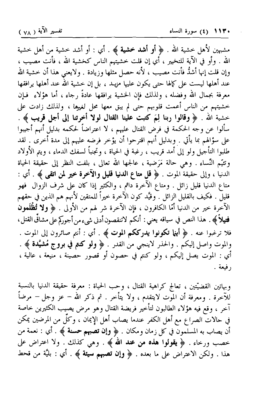 مشبهين لأهل خشية الله. أَوْ أَشَدَّ خَشْيَةً. أي: أو أشد خشية من أهل خشية الله. وأو في الآية للتخيير، أي إن قلت خشيتهم الناس كخشية الله، فأنت مصيب، وإن قلت إنها أشد فأنت مصيب، لأنه حصل مثلها وزيادة. ولا يعني هذا أن خشية الله عند أهلها ليست على كمالها حتى يكون عليها مزيد، بل إن خشية الله عند أهلها يرافقها معرفة بجمال الله وفضله، ولذلك فإن الخشية يرافقها عادة رجاء، أما هؤلاء فإن خشيتهم من الناس أعمت قلوبهم حتى لم يبق معها محل لغيرها، ولذلك زادت على خشية الله. وَقالُوا رَبَّنا لِمَ كَتَبْتَ عَلَيْنَا الْقِتالَ لَوْلا أَخَّرْتَنا إِلى أَجَلٍ قَرِيبٍ.