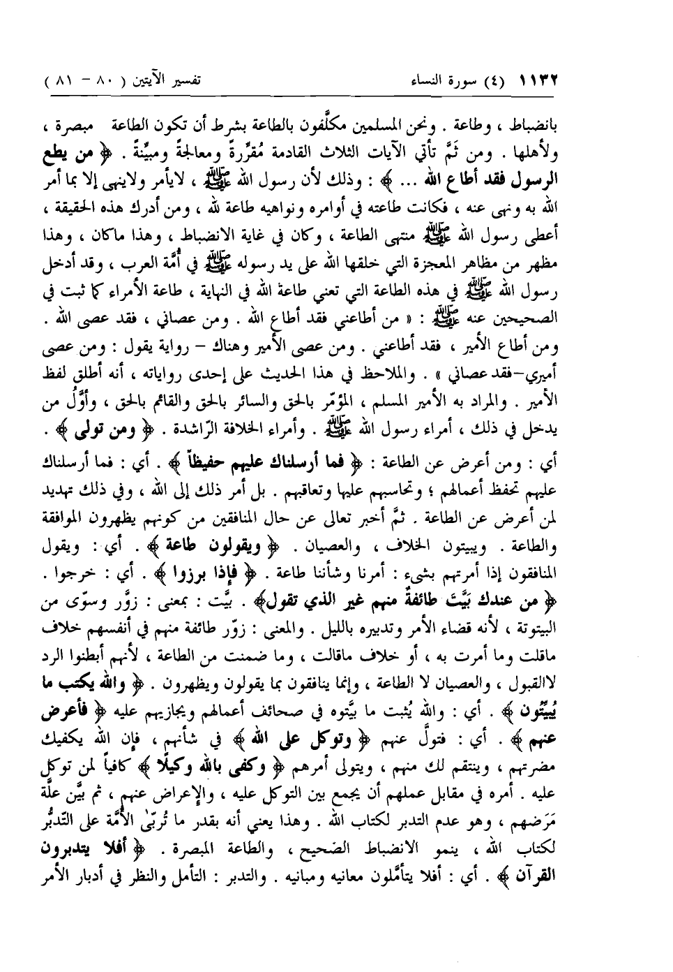 مَنْ يُطِعِ الرَّسُولَ فَقَدْ أَطاعَ اللَّهَ ... : وذلك لأن رسول الله صلى الله عليه وسلم، لا يأمر ولا ينهى إلا بما أمر الله به ونهى عنه، فكانت طاعته في أوامره ونواهيه طاعة لله، ومن أدرك هذه الحقيقة، أعطى رسول الله صلى الله عليه وسلم منتهى الطاعة، وكان في غاية الانضباط، وهذا ما كان، وهذا مظهر من مظاهر المعجزة التي خلقها الله على يد رسوله صلى الله عليه وسلم في أمة العرب، وقد أدخل رسول الله صلى الله عليه وسلم في هذه الطاعة التي تعني طاعة الله في النهاية، طاعة الأمراء كما ثبت في الصحيحين عنه صلى الله عليه وسلم: «من أطاعني فقد أطاع الله. ومن عصاني، فقد عصى الله.