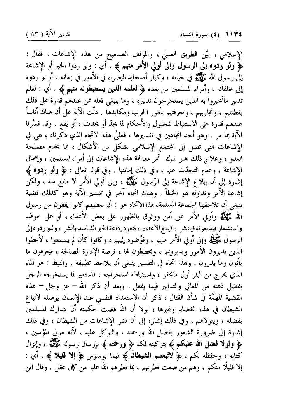 وَلَوْ رَدُّوهُ إِلَى الرَّسُولِ وَإِلى أُولِي الْأَمْرِ مِنْهُمْ. أي: ولو ردوا الخبر أو الإشاعة إلى رسول الله صلى الله عليه وسلم في حياته، وكبار أصحابه البصراء في الأمور في زمانه، أو لو ردوه إلى خلفائه، وأمراء المسلمين من بعده لَعَلِمَهُ الَّذِينَ يَسْتَنْبِطُونَهُ مِنْهُمْ. أي: لعلم تدبير ما أخبروا به الذين يستخرجون تدبيره، وما ينبغي فعله ممن عندهم قدرة على ذلك بفطنتهم، وتجاربهم، ومعرفتهم بأمور الحرب ومكايدها. دلت الآية على أن هناك أناسا عندهم قدرة على الاستنباط للحلول والأحكام لما يجد أو يحدث، أو يقع. وقد فسرنا الآية بما مر، وهو أحد اتجاهين في تفسيرها، فعلى هذا الاتجاه الذي ذكرناه، هي في الإشاعات التي تصل إلى المجتمع الإسلامي بشكل من الأشكال، مما يخدم مصلحة العدو، وعلاج ذلك هو ترك أمر معالجة هذه الإشاعات إلى أمراء المسلمين، وإهمال الإشاعة، وعدم التحدث عنها، وفي ذلك إماتتها. وفي قوله تعالى: وَلَوْ رَدُّوهُ إشارة إلى أن إبلاغ الإشاعة إلى الرسول صلى الله عليه وسلم، وإلى أولي الأمر لا مانع منه، ولكن إشاعة الأمر وتداوله هو الخطأ. وهناك اتجاه آخر في تفسير الآية وهو كذلك قضية ينبغي أن تلاحقها الجماعة المسلمة، هذا الاتجاه هو: أن بعضهم كانوا يقفون من رسول الله صلى الله عليه وسلم وأولي الأمر على أمن ووثوق بالظهور على بعض الأعداء، أو على خوف واستشعار فيذيعونه فينتشر، فيبلغ الأعداء، فتعود إذاعة الخبر الفاسد بالشر، ولو ردوه إلى الرسول صلى الله عليه وسلم وإلى أولي الأمر منهم، وفوضوه إليهم، وكانوا كأن لم يسمعوا، لأعطوا الذين يدبرون الأمور ويديرونها، ويخططون لها، فرصة الإدارة الصالحة، فيعرفون ما يأتون وما يذرون. وهذا اتجاه في التفسير ينبغي أن يلاحظ تطبيقه. والنبط: هو الماء الذي يخرج من البئر أول ما تحفر، واستنباطه استخراجه، فاستعير لما يستخرجه الرجل بفضل ذهنه من المعاني والتدابير فيما يفعل. وبعد أن ذكر الله- عزّ وجل- هذه القضية المهمة في شأن القتال، ذكر أن الاستعداد النفسي عند الإنسان يوصله لاتباع الشيطان في هذه القضايا وغيرها، لولا أن الله قضت حكمته أن يتدارك المسلمين بفضله، ويتولاهم، وفي ذلك إشارة إلى أن نشر الإشاعات من الشيطان، وفي ذلك إشارة إلى ضرورة الشعور بفضل الله ورحمته، والتوكل عليه، لأنه مولى المؤمنين، وَلَوْلا فَضْلُ اللَّهِ عَلَيْكُمْ بتزكيته لكم وَرَحْمَتُهُ بإرسال رسوله صلى الله عليه وسلم، وإنزال كتابه، وحفظه لكم، لَاتَّبَعْتُمُ الشَّيْطانَ فيما يوسوس إِلَّا قَلِيلًا. أي: