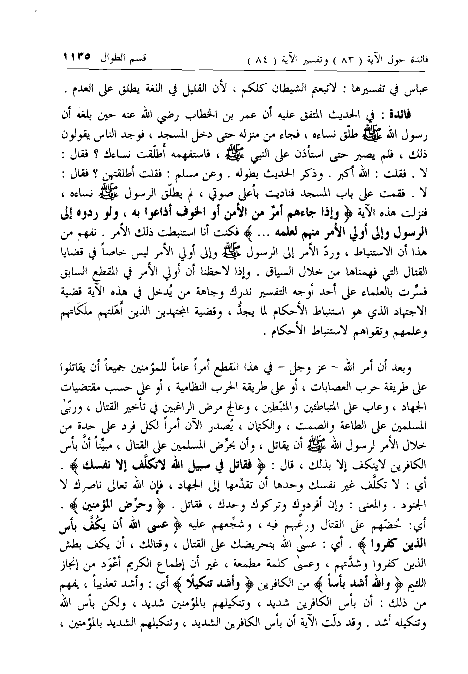 وبعد أن أمر الله- عزّ وجل- في هذا المقطع أمرا عاما للمؤمنين جميعا أن يقاتلوا على طريقة حرب العصابات، أو على طريقة الحرب النظامية، أو على حسب مقتضيات الجهاد، وعاب على المتباطئين والمثبطين، وعالج مرض الراغبين في تأخير القتال، وربى المسلمين على الطاعة والصمت، والكتمان، يصدر الآن أمرا لكل فرد على حدة من خلال الأمر لرسول الله صلى الله عليه وسلم أن يقاتل، وأن يحرض المسلمين على القتال، مبينا أن بأس الكافرين لا ينكف إلا بذلك، قال: فَقاتِلْ فِي سَبِيلِ اللَّهِ لا تُكَلَّفُ إِلَّا نَفْسَكَ.