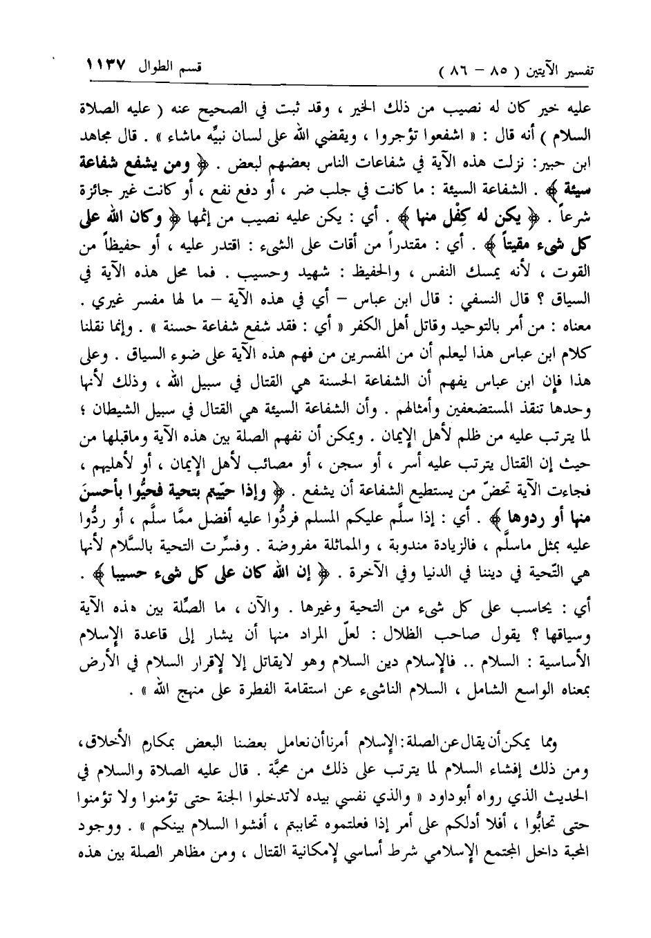 معناه: من أمر بالتوحيد وقاتل أهل الكفر «أي: فقد شفع شفاعة حسنة». وإنما نقلنا كلام ابن عباس هذا ليعلم أن من المفسرين من فهم هذه الآية على ضوء السياق. وعلى هذا فإن ابن عباس يفهم أن الشفاعة الحسنة هي القتال في سبيل الله، وذلك لأنها وحدها تنقذ المستضعفين وأمثالهم. وأن الشفاعة السيئة هي القتال في سبيل الشيطان؛ لما يترتب عليه من ظلم لأهل الإيمان. ويمكن أن نفهم الصلة بين هذه الآية وما قبلها من حيث إن القتال يترتب عليه أسر، أو سجن، أو مصائب لأهل الإيمان، أو لأهليهم،