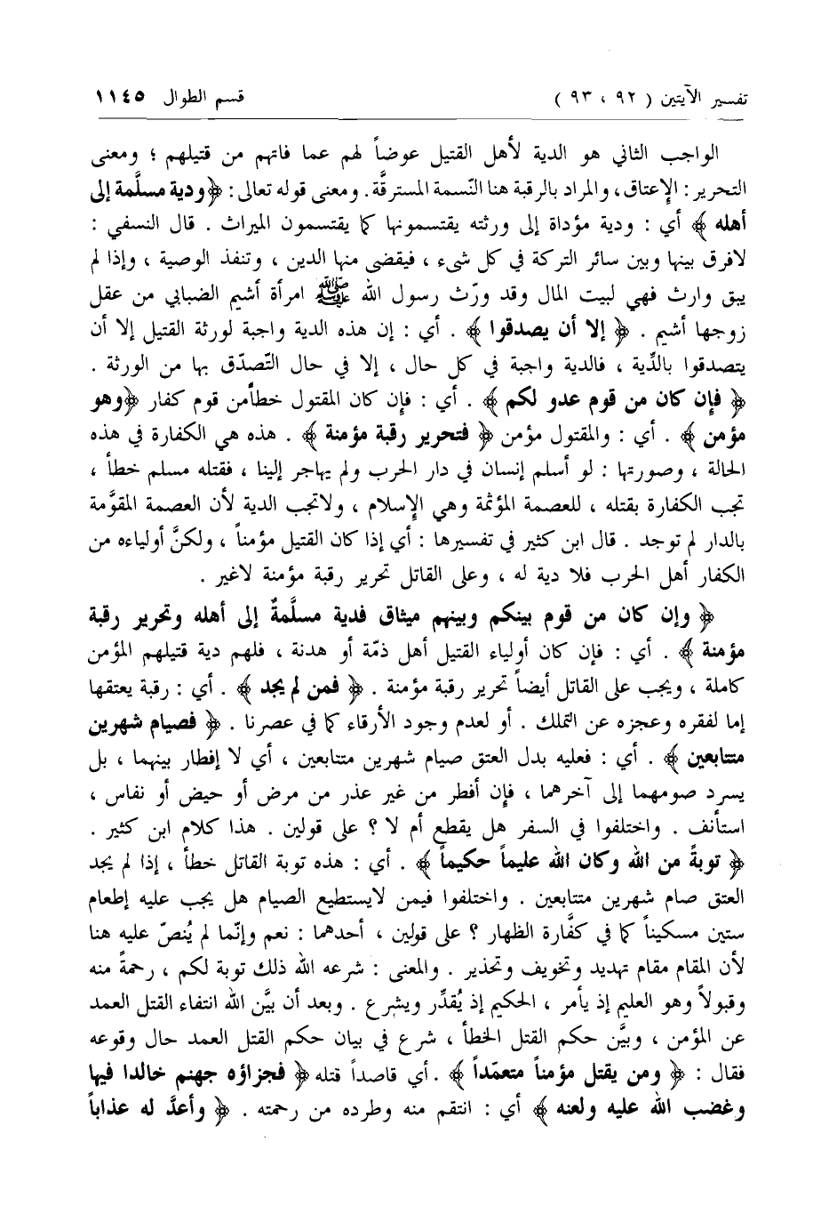 وَإِنْ كانَ مِنْ قَوْمٍ بَيْنَكُمْ وَبَيْنَهُمْ مِيثاقٌ فَدِيَةٌ مُسَلَّمَةٌ إِلى أَهْلِهِ وَتَحْرِيرُ رَقَبَةٍ مُؤْمِنَةٍ. أي: فإن كان أولياء القتيل أهل ذمة أو هدنة، فلهم دية قتيلهم المؤمن كاملة، ويجب على القاتل أيضا تحرير رقبة مؤمنة. فَمَنْ لَمْ يَجِدْ. أي: رقبة يعتقها إما لفقره وعجزه عن التملك. أو لعدم وجود الأرقاء كما في عصرنا. فَصِيامُ شَهْرَيْنِ مُتَتابِعَيْنِ. أي: فعليه بدل العتق صيام شهرين متتابعين، أي لا إفطار بينهما، بل يسرد صومهما إلى آخرهما، فإن أفطر من غير عذر من مرض أو حيض أو نفاس، استأنف. واختلفوا في السفر هل يقطع أم لا؟ على قولين. هذا كلام ابن كثير.