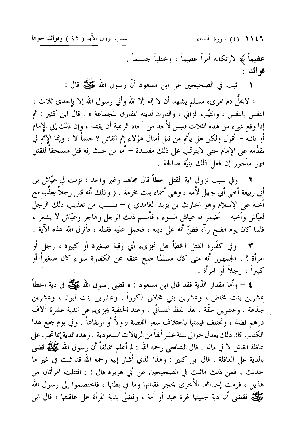 النفس بالنفس، والثيب الزاني، والتارك لدينه المفارق للجماعة». قال ابن كثير: ثم إذا وقع شئ من هذه الثلاث فليس لأحد من آحاد الرعية أن يقتله، وإن ذلك إلى الإمام أو نائبه- أقول ولكن هل يأثم من قتل أمثال هؤلاء إثم القاتل؟ حتما لا، وإنما الإثم في تقدمه على الإمام حتى لا يترتب على ذلك مفسدة- أما من حيث إنه قتل مستحقا للقتل فهو مأجور إن فعل ذلك بنية صالحة.
