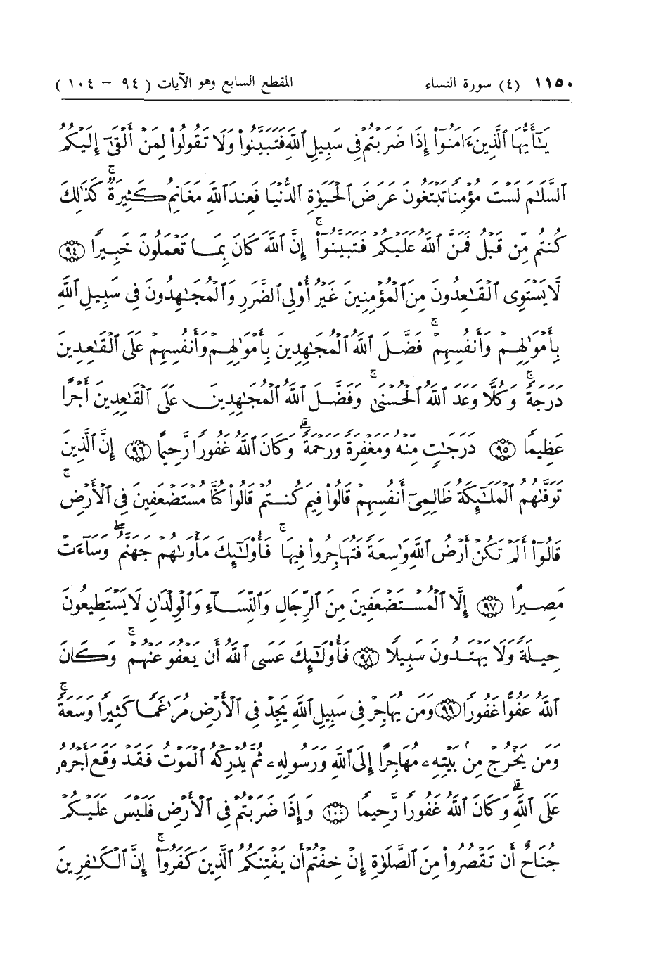 يا أَيُّهَا الَّذِينَ آمَنُوا إِذا ضَرَبْتُمْ فِي سَبِيلِ اللَّهِ فَتَبَيَّنُوا وَلا تَقُولُوا لِمَنْ أَلْقى إِلَيْكُمُ السَّلامَ لَسْتَ مُؤْمِناً تَبْتَغُونَ عَرَضَ الْحَياةِ الدُّنْيا فَعِنْدَ اللَّهِ مَغانِمُ كَثِيرَةٌ كَذلِكَ كُنْتُمْ مِنْ قَبْلُ فَمَنَّ اللَّهُ عَلَيْكُمْ فَتَبَيَّنُوا إِنَّ اللَّهَ كانَ بِما تَعْمَلُونَ خَبِيراً (94) لا يَسْتَوِي الْقاعِدُونَ مِنَ الْمُؤْمِنِينَ غَيْرُ أُولِي الضَّرَرِ وَالْمُجاهِدُونَ فِي سَبِيلِ اللَّهِ بِأَمْوالِهِمْ وَأَنْفُسِهِمْ فَضَّلَ اللَّهُ الْمُجاهِدِينَ بِأَمْوالِهِمْ وَأَنْفُسِهِمْ عَلَى الْقاعِدِينَ دَرَجَةً وَكُلاًّ وَعَدَ اللَّهُ الْحُسْنى وَفَضَّلَ اللَّهُ الْمُجاهِدِينَ عَلَى الْقاعِدِينَ أَجْراً عَظِيماً (95) دَرَجاتٍ مِنْهُ وَمَغْفِرَةً وَرَحْمَةً وَكانَ اللَّهُ غَفُوراً رَحِيماً (96) إِنَّ الَّذِينَ تَوَفَّاهُمُ الْمَلائِكَةُ ظالِمِي أَنْفُسِهِمْ قالُوا فِيمَ كُنْتُمْ قالُوا كُنَّا مُسْتَضْعَفِينَ فِي الْأَرْضِ قالُوا أَلَمْ تَكُنْ أَرْضُ اللَّهِ واسِعَةً فَتُهاجِرُوا فِيها فَأُولئِكَ مَأْواهُمْ جَهَنَّمُ وَساءَتْ مَصِيراً (97) إِلاَّ الْمُسْتَضْعَفِينَ مِنَ الرِّجالِ وَالنِّساءِ وَالْوِلْدانِ لا يَسْتَطِيعُونَ حِيلَةً وَلا يَهْتَدُونَ سَبِيلاً (98)