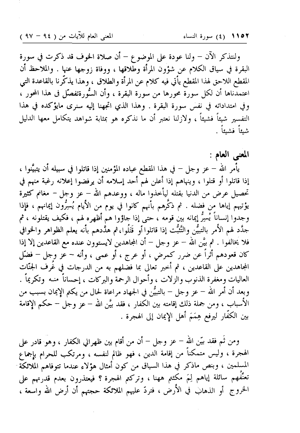 يأمر الله- عزّ وجل- في هذا المقطع عباده المؤمنين إذا قاتلوا في سبيله أن يتبينوا، إذا قاتلوا أو قتلوا، وينهاهم إذا أعلن لهم أحد إسلامه أن يرفضوا إعلانه رغبة منهم في تحصيل عرض من الدنيا بقتله ليأخذوا ماله، ووعدهم الله- عزّ وجل- مغانم كثيرة يؤتيهم إياها من فضله. ثم ذكرهم بأنهم كانوا في يوم من الأيام يسرون إيمانهم، فإذا وجدوا إنسانا يسر إيمانه بين قومه، حتى إذا جاءوا هم أظهره لهم، فكيف يقتلونه، ثم جدد لهم الأمر بالتبين والتثبت إذا قاتلوا أو قتلوا، ثم هددهم بأنه يعلم الظواهر والخوافي فلا يخالفوا. ثم بين الله- عزّ وجل- أن المجاهدين لا يستوون عنده مع القاعدين إلا إذا كان قعودهم أثرا عن ضرر كمرض، أو عرج، أو عمى، وأنه- عزّ وجل- فضل المجاهدين على القاعدين، ثم أخبر تعالى بما فضلهم به من الدرجات في غرف الجنات العاليات ومغفرة الذنوب والزلات، وأحوال الرحمة والبركات، إحسانا منه وتكريما.