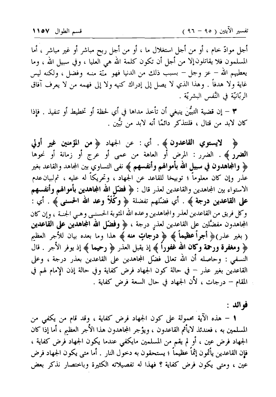 لا يَسْتَوِي الْقاعِدُونَ. أي: عن الجهاد مِنَ الْمُؤْمِنِينَ غَيْرُ أُولِي الضَّرَرِ. الضرر: المرض أو العاهة من عمى أو عرج أو زمانة أو نحوها وَالْمُجاهِدُونَ فِي سَبِيلِ اللَّهِ بِأَمْوالِهِمْ وَأَنْفُسِهِمْ نفى التساوي بين المجاهد والقاعد بغير عذر وإن كان معلوما؛ توبيخا للقاعد عن الجهاد، وتحريكا له عليه، ثم لبيان عدم الاستواء بين المجاهدين والقاعدين لعذر قال: فَضَّلَ اللَّهُ الْمُجاهِدِينَ بِأَمْوالِهِمْ وَأَنْفُسِهِمْ عَلَى الْقاعِدِينَ دَرَجَةً. أي فضلهم تفضلة وَكُلًّا وَعَدَ اللَّهُ الْحُسْنى. أي: