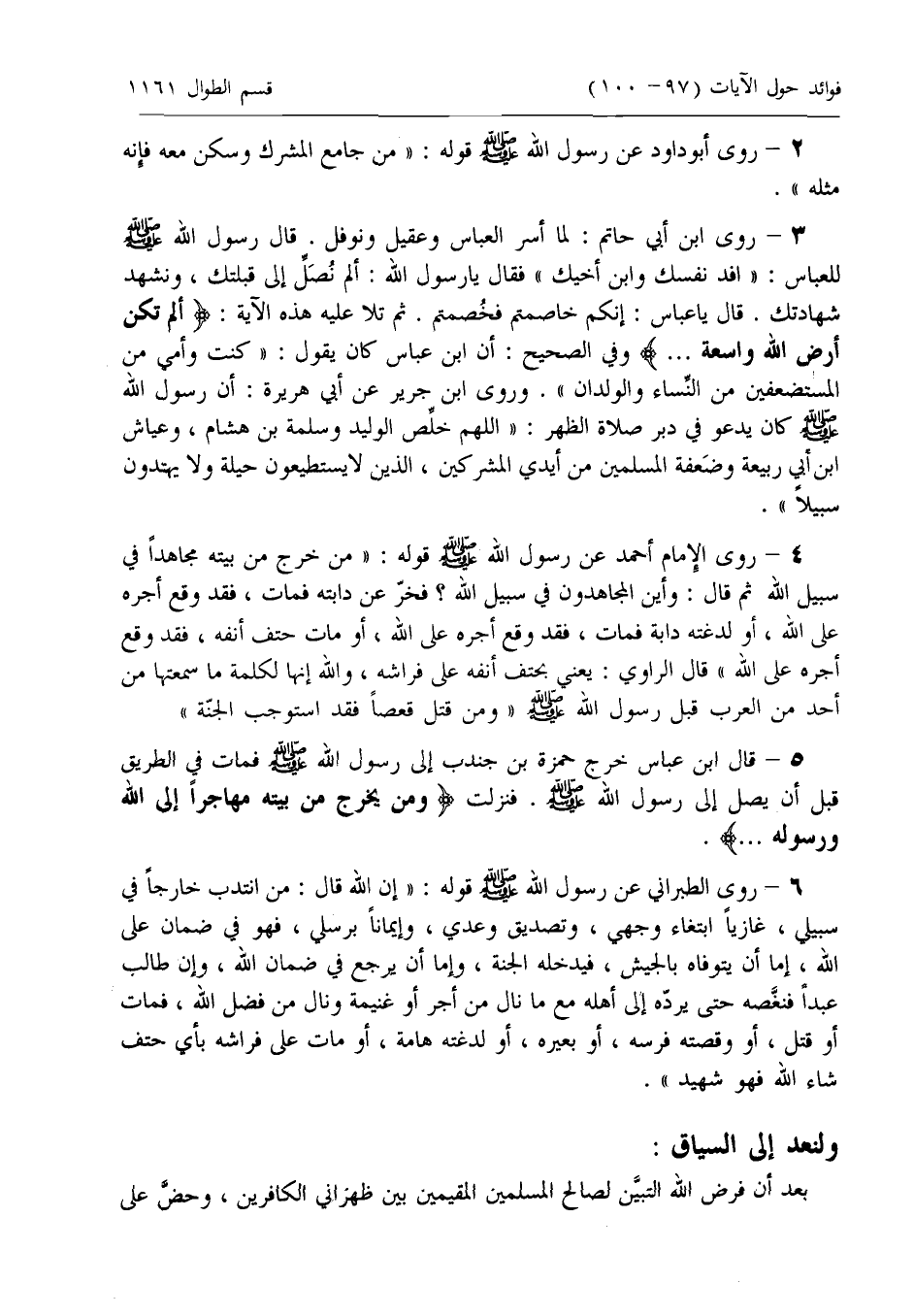 3 - روى ابن أبي حاتم: لما أسر العباس وعقيل ونوفل. قال رسول الله صلى الله عليه وسلم للعباس: «افد نفسك وابن أخيك» فقال يا رسول الله: ألم نصل إلى قبلتك، ونشهد شهادتك. قال يا عباس: إنكم خاصمتم فخصمتم. ثم تلا عليه هذه الآية: أَلَمْ تَكُنْ أَرْضُ اللَّهِ واسِعَةً ... وفي الصحيح: أن ابن عباس كان يقول: «كنت وأمي من المستضعفين من النساء والولدان». وروى ابن جرير عن أبي هريرة: أن رسول الله صلى الله عليه وسلم كان يدعو في دبر صلاة الظهر: «اللهم خلص الوليد وسلمة بن هشام، وعياش ابن أبي ربيعة وضعفة المسلمين من أيدي المشركين، الذين لا يستطيعون حيلة ولا يهتدون سبيلا».