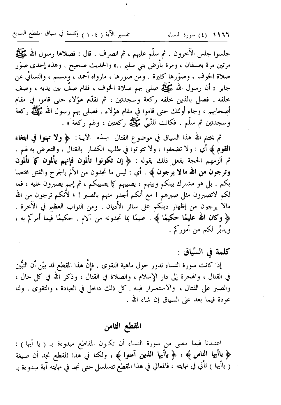 إذا كانت سورة النساء تدور حول ماهية التقوى. فإن هذا المقطع قد بين أن التبين في القتال، والهجرة إلى دار الإسلام، والصلاة في القتال، وذكر الله في كل حال، والصبر على القتال، والاستمرار فيه. كل ذلك داخل في العبادة، والتقوى. ولنا عودة فيما بعد على السياق إن شاء الله.