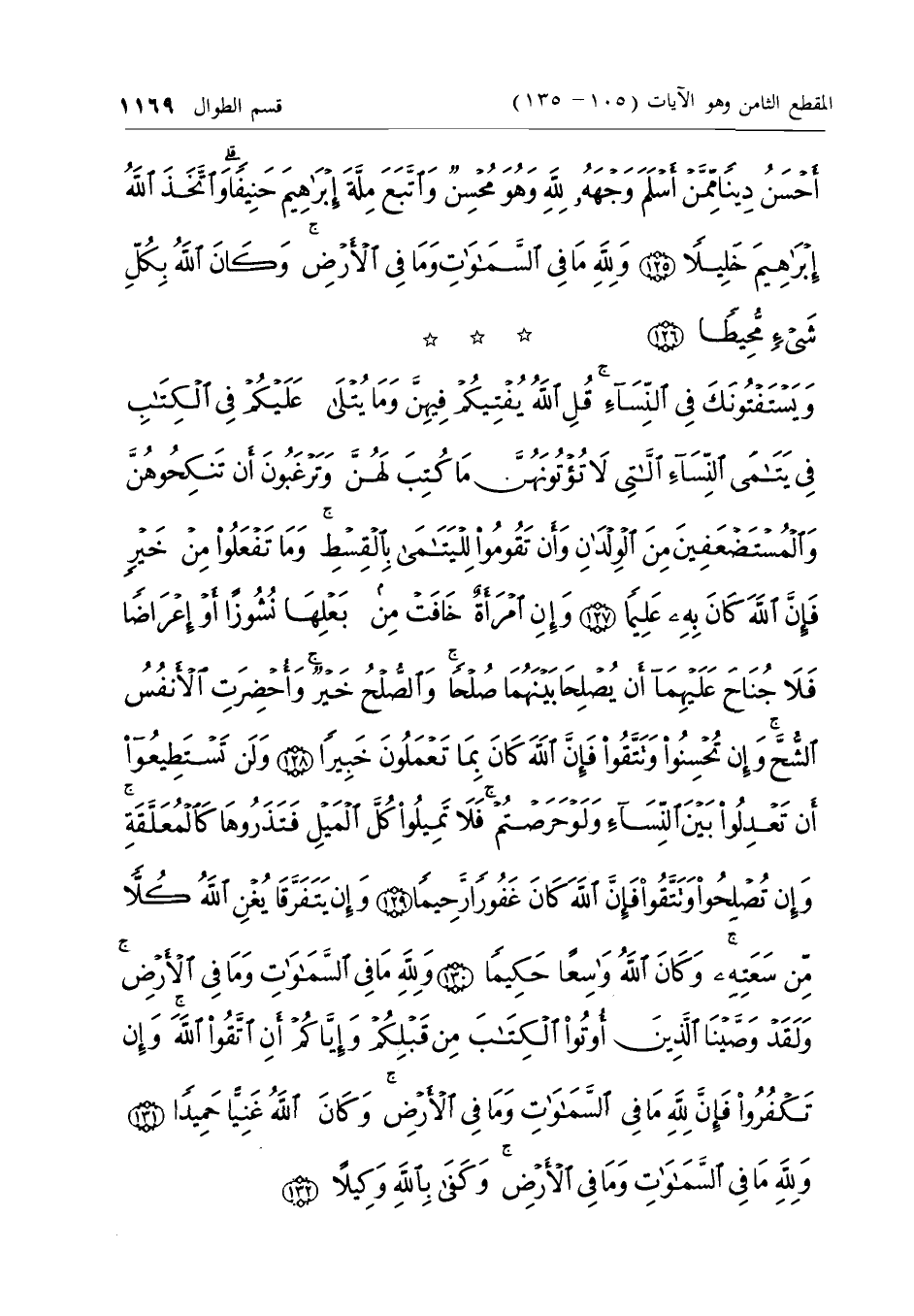 وَيَسْتَفْتُونَكَ فِي النِّساءِ قُلِ اللَّهُ يُفْتِيكُمْ فِيهِنَّ وَما يُتْلى عَلَيْكُمْ فِي الْكِتابِ فِي يَتامَى النِّساءِ اللاَّتِي لا تُؤْتُونَهُنَّ ما كُتِبَ لَهُنَّ وَتَرْغَبُونَ أَنْ تَنْكِحُوهُنَّ وَالْمُسْتَضْعَفِينَ مِنَ الْوِلْدانِ وَأَنْ تَقُومُوا لِلْيَتامى بِالْقِسْطِ وَما تَفْعَلُوا مِنْ خَيْرٍ فَإِنَّ اللَّهَ كانَ بِهِ عَلِيماً (127) وَإِنِ امْرَأَةٌ خافَتْ مِنْ بَعْلِها نُشُوزاً أَوْ إِعْراضاً فَلا جُناحَ عَلَيْهِما أَنْ يُصْلِحا بَيْنَهُما صُلْحاً وَالصُّلْحُ خَيْرٌ وَأُحْضِرَتِ الْأَنْفُسُ الشُّحَّ وَإِنْ تُحْسِنُوا وَتَتَّقُوا فَإِنَّ اللَّهَ كانَ بِما تَعْمَلُونَ خَبِيراً (128) وَلَنْ تَسْتَطِيعُوا أَنْ تَعْدِلُوا بَيْنَ النِّساءِ وَلَوْ حَرَصْتُمْ فَلا تَمِيلُوا كُلَّ الْمَيْلِ فَتَذَرُوها كَالْمُعَلَّقَةِ وَإِنْ تُصْلِحُوا وَتَتَّقُوا فَإِنَّ اللَّهَ كانَ غَفُوراً رَحِيماً (129) وَإِنْ يَتَفَرَّقا يُغْنِ اللَّهُ كُلاًّ مِنْ سَعَتِهِ وَكانَ اللَّهُ واسِعاً حَكِيماً (130) وَلِلَّهِ ما فِي السَّماواتِ وَما فِي الْأَرْضِ وَلَقَدْ وَصَّيْنَا الَّذِينَ أُوتُوا الْكِتابَ مِنْ قَبْلِكُمْ وَإِيَّاكُمْ أَنِ اتَّقُوا اللَّهَ وَإِنْ تَكْفُرُوا فَإِنَّ لِلَّهِ ما فِي السَّماواتِ وَما فِي الْأَرْضِ وَكانَ اللَّهُ غَنِيًّا حَمِيداً (131)