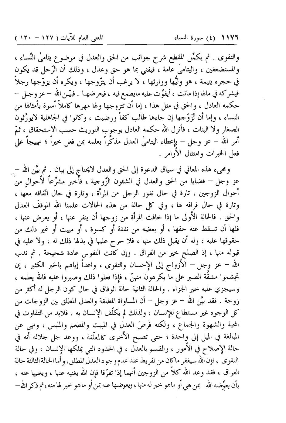 ومجئ هذه المعاني في سياق الدعوة إلى الحق والعدل لا يحتاج إلى بيان. ثم بين الله- عزّ وجل- قضايا من الحق والعدل في الشئون الزوجية، فأخبر مشرعا لأحوال من أحوال الزوجين، تارة في حال نفور الرجل من المرأة، وتارة في حال اتفاقه معها، وتارة في حال فراقه لها، وفي كل حالة من هذه الحالات علمنا الله الموقف العدل والحق. فالحالة الأولى ما إذا خافت المرأة من زوجها أن ينفر عنها، أو يعرض عنها، فلها أن تسقط عنه حقها، أو بعضه من نفقة أو كسوة، أو مبيت أو غير ذلك من حقوقها عليه، وله أن يقبل ذلك منها، فلا حرج عليها في بذلها ذلك له، ولا عليه في قبوله منها، إذ الصلح خير من الفراق. وإن كانت النفوس عادة شحيحة. ثم ندب الله- عزّ وجل- الأزواج إلى الإحسان والتقوى، واعدا إياهم بالخير الكثير، إن تجشموا مشقة الصبر على ما يكرهون منهن، فإذا فعلوا ذلك وصبروا عليه فالله يعلمه، وسيجزي عليه خير الجزاء. والحالة الثانية حالة الوفاق في حال كون الرجل له أكثر من زوجة. فقد بين الله- عزّ وجل- أن المساواة المطلقة والعدل المطلق بين الزوجات من كل الوجوه غير مستطاع للإنسان، ولذلك لم يكلف الإنسان به، فلا بد من التفاوت في المحبة والشهوة والجماع، ولكنه فرض العدل في المبيت والمطعم والملبس، ونهى عن المبالغة في الميل إلى واحدة؛ حتى تصبح الأخرى كالمعلقة، ووعد جل جلاله أنه في حالة الإصلاح في الأمور، والقسم بالعدل، في الحدود التي يملكها الإنسان، وفي حالة التقوى، فإن الله سيغفر ما كان من تفريط عند عدم وجود العدل المطلق، وأما الحالة الثالثة حالة الفراق، فقد وعد الله كلا من الزوجين أنهما إذا تفرقا فإن الله يغنيه عنها، ويغنيها عنه، بأن يعوضه الله بمن هي أو ما هو خير له منها، ويعوضها عنه بمن أو ما هو خير لها منه، ثم ذكر الله-