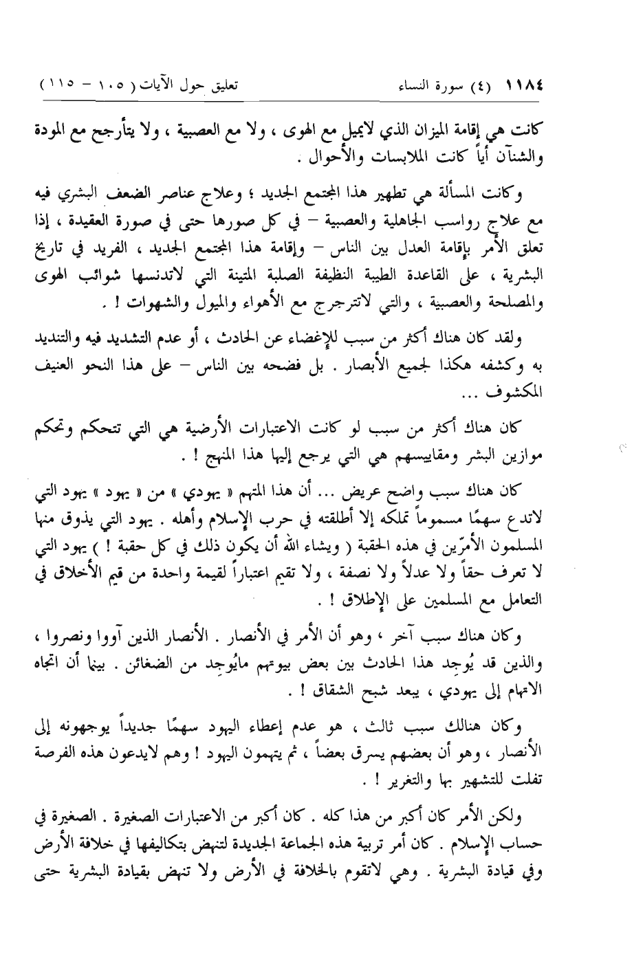 وكانت المسألة هي تطهير هذا المجتمع الجديد؛ وعلاج عناصر الضعف البشري فيه مع علاج رواسب الجاهلية والعصبية- في كل صورها حتى في صورة العقيدة، إذا تعلق الأمر بإقامة العدل بين الناس- وإقامة هذا المجتمع الجديد، الفريد في تاريخ البشرية، على القاعدة الطيبة النظيفة الصلبة المتينة التي لا تدنسها شوائب الهوى والمصلحة والعصبية، والتي لا تترجرج مع الأهواء والميول والشهوات!.