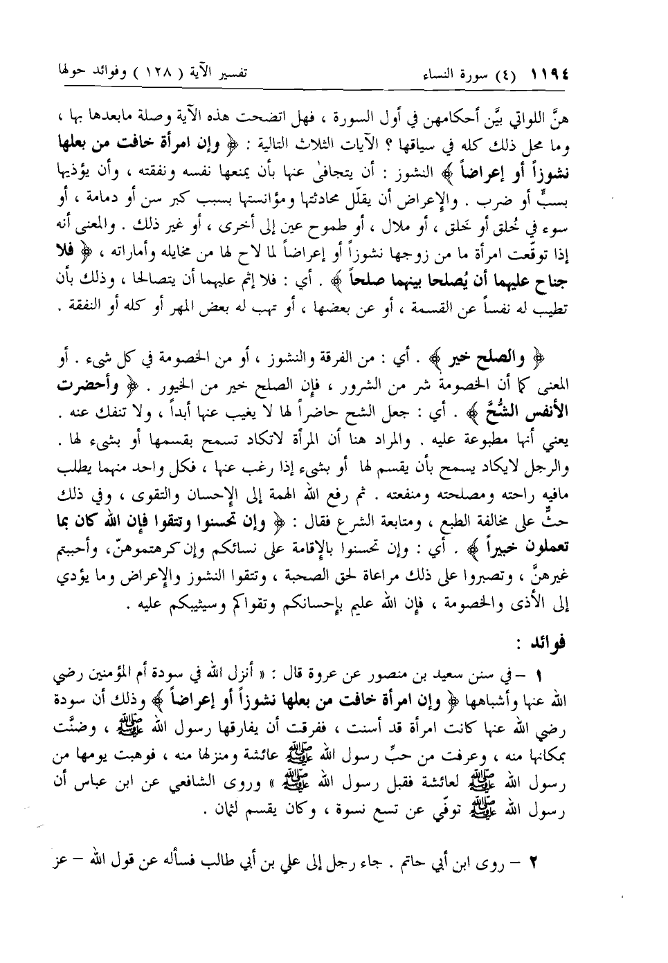 وَإِنِ امْرَأَةٌ خافَتْ مِنْ بَعْلِها نُشُوزاً أَوْ إِعْراضاً النشوز: أن يتجافى عنها بأن يمنعها نفسه ونفقته، وأن يؤذيها بسب أو ضرب. والإعراض أن يقلل محادثتها ومؤانستها بسبب كبر سن أو دمامة، أو سوء في خلق أو خلق، أو ملال، أو طموح عين إلى أخرى، أو غير ذلك. والمعنى أنه إذا توقعت امرأة ما من زوجها نشوزا أو إعراضا لما لاح لها من مخايله وأماراته، فَلا جُناحَ عَلَيْهِما أَنْ يُصْلِحا بَيْنَهُما صُلْحاً. أي: فلا إثم عليهما أن يتصالحا، وذلك بأن تطيب له نفسا عن القسمة، أو عن بعضها، أو تهب له بعض المهر أو كله أو النفقة.