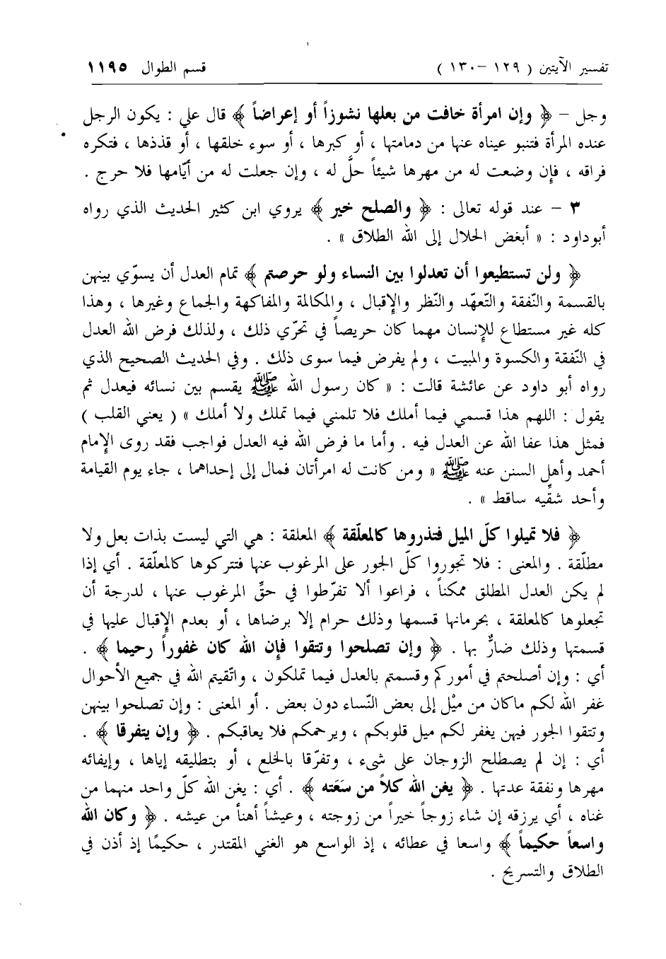 وَلَنْ تَسْتَطِيعُوا أَنْ تَعْدِلُوا بَيْنَ النِّساءِ وَلَوْ حَرَصْتُمْ تمام العدل أن يسوي بينهن بالقسمة والنفقة والتعهد والنظر والإقبال، والمكالمة والمفاكهة والجماع وغيرها، وهذا كله غير مستطاع للإنسان مهما كان حريصا في تحري ذلك، ولذلك فرض الله العدل في النفقة والكسوة والمبيت، ولم يفرض فيما سوى ذلك. وفي الحديث الصحيح الذي رواه أبو داود عن عائشة قالت: «كان رسول الله صلى الله عليه وسلم يقسم بين نسائه فيعدل ثم يقول: اللهم هذا قسمي فيما أملك فلا تلمني فيما تملك ولا أملك» (يعني القلب) فمثل هذا عفا الله عن العدل فيه. وأما ما فرض الله فيه العدل فواجب فقد روى الإمام أحمد وأهل السنن عنه صلى الله عليه وسلم «ومن كانت له امرأتان فمال إلى إحداهما، جاء يوم القيامة وأحد شقيه ساقط».
