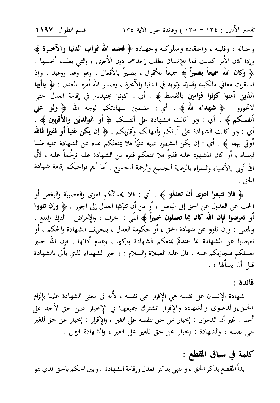 وإذ استقرت معاني مالكيته وقدرته وثوابه في الدنيا والآخرة، يصدر الله أمره بالعدل: يا أَيُّهَا الَّذِينَ آمَنُوا كُونُوا قَوَّامِينَ بِالْقِسْطِ. أي: كونوا مجتهدين في إقامة العدل حتى لا تجوروا. شُهَداءَ لِلَّهِ. أي: مقيمين شهادتكم لوجه الله وَلَوْ عَلى أَنْفُسِكُمْ. أي: ولو كانت الشهادة على أنفسكم أَوِ الْوالِدَيْنِ وَالْأَقْرَبِينَ.