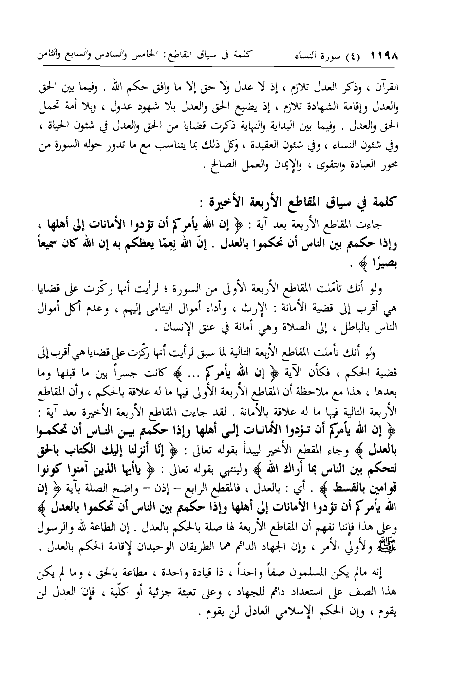 إِنَّ اللَّهَ يَأْمُرُكُمْ أَنْ تُؤَدُّوا الْأَماناتِ إِلى أَهْلِها وَإِذا حَكَمْتُمْ بَيْنَ النَّاسِ أَنْ تَحْكُمُوا بِالْعَدْلِ وجاء المقطع الأخير ليبدأ بقوله تعالى: إِنَّا أَنْزَلْنا إِلَيْكَ الْكِتابَ بِالْحَقِّ لِتَحْكُمَ بَيْنَ النَّاسِ بِما أَراكَ اللَّهُ ولينتهي بقوله تعالى: يا أَيُّهَا الَّذِينَ آمَنُوا كُونُوا قَوَّامِينَ بِالْقِسْطِ. أي: بالعدل، فالمقطع الرابع- إذن- واضح الصلة بآية إِنَّ اللَّهَ يَأْمُرُكُمْ أَنْ تُؤَدُّوا الْأَماناتِ إِلى أَهْلِها وَإِذا حَكَمْتُمْ بَيْنَ النَّاسِ أَنْ تَحْكُمُوا بِالْعَدْلِ وعلى هذا فإننا نفهم أن المقاطع الأربعة لها صلة بالحكم بالعدل. إن الطاعة لله والرسول صلى الله عليه وسلم ولأولي الأمر، وإن الجهاد الدائم هما الطريقان الوحيدان لإقامة الحكم بالعدل.