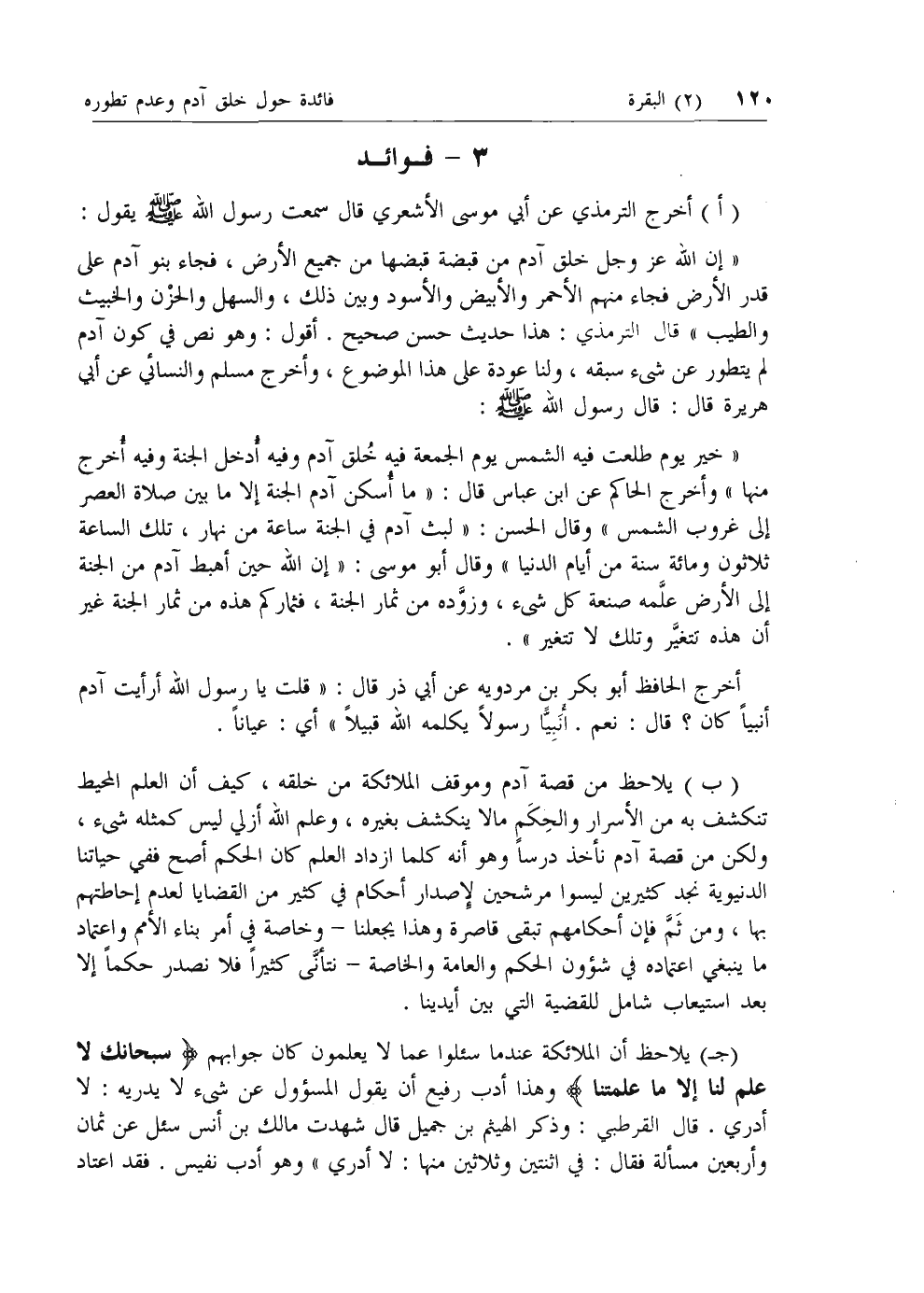 (ب) يلاحظ من قصة آدم وموقف الملائكة من خلقه، كيف أن العلم المحيط تنكشف به من الأسرار والحكم ما لا ينكشف بغيره، وعلم الله أزلي ليس كمثله شئ، ولكن من قصة آدم نأخذ درسا وهو أنه كلما ازداد العلم كان الحكم أصح ففي حياتنا الدنيوية نجد كثيرين ليسوا مرشحين لإصدار أحكام في كثير من القضايا لعدم إحاطتهم بها، ومن ثم فإن أحكامهم تبقى قاصرة وهذا يجعلنا- وخاصة في أمر بناء الأمم واعتماد ما ينبغي اعتماده في شئون الحكم والعامة والخاصة- نتأنى كثيرا فلا نصدر حكما إلا بعد استيعاب شامل للقضية التي بين أيدينا.