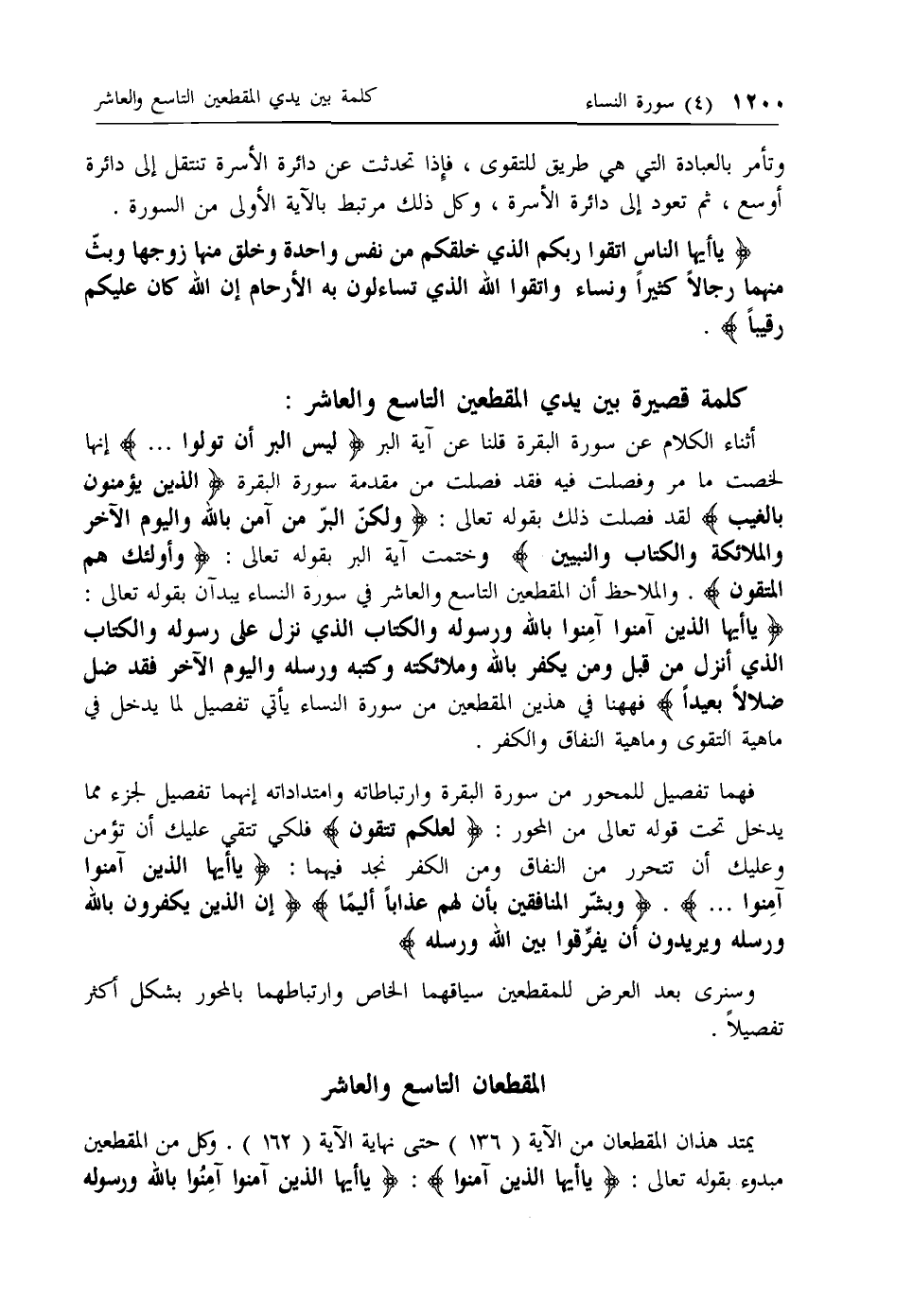 أثناء الكلام عن سورة البقرة قلنا عن آية البر لَيْسَ الْبِرَّ أَنْ تُوَلُّوا ... إنها لخصت ما مر وفصلت فيه فقد فصلت من مقدمة سورة البقرة الَّذِينَ يُؤْمِنُونَ بِالْغَيْبِ لقد فصلت ذلك بقوله تعالى: وَلكِنَّ الْبِرَّ مَنْ آمَنَ بِاللَّهِ وَالْيَوْمِ الْآخِرِ وَالْمَلائِكَةِ وَالْكِتابِ وَالنَّبِيِّينَ وختمت آية البر بقوله تعالى: وَأُولئِكَ هُمُ الْمُتَّقُونَ. والملاحظ أن المقطعين التاسع والعاشر في سورة النساء يبدءان بقوله تعالى: