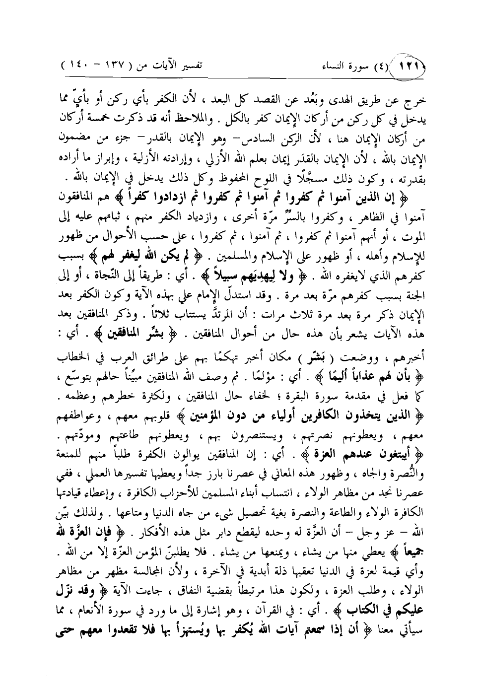 إِنَّ الَّذِينَ آمَنُوا ثُمَّ كَفَرُوا ثُمَّ آمَنُوا ثُمَّ كَفَرُوا ثُمَّ ازْدادُوا كُفْراً هم المنافقون آمنوا في الظاهر، وكفروا بالسر مرة أخرى، وازدياد الكفر منهم، ثباتهم عليه إلى الموت، أو أنهم آمنوا ثم كفروا، ثم آمنوا، ثم كفروا، على حسب الأحوال من ظهور للإسلام وأهله، أو ظهور على الإسلام والمسلمين. لَمْ يَكُنِ اللَّهُ لِيَغْفِرَ لَهُمْ بسبب كفرهم الذي لا يغفره الله. وَلا لِيَهْدِيَهُمْ سَبِيلًا. أي: طريقا إلى النجاة، أو إلى الجنة بسبب كفرهم مرة بعد مرة. وقد استدل الإمام علي بهذه الآية وكون الكفر بعد الإيمان ذكر مرة بعد مرة ثلاث مرات: أن المرتد يستتاب ثلاثا.