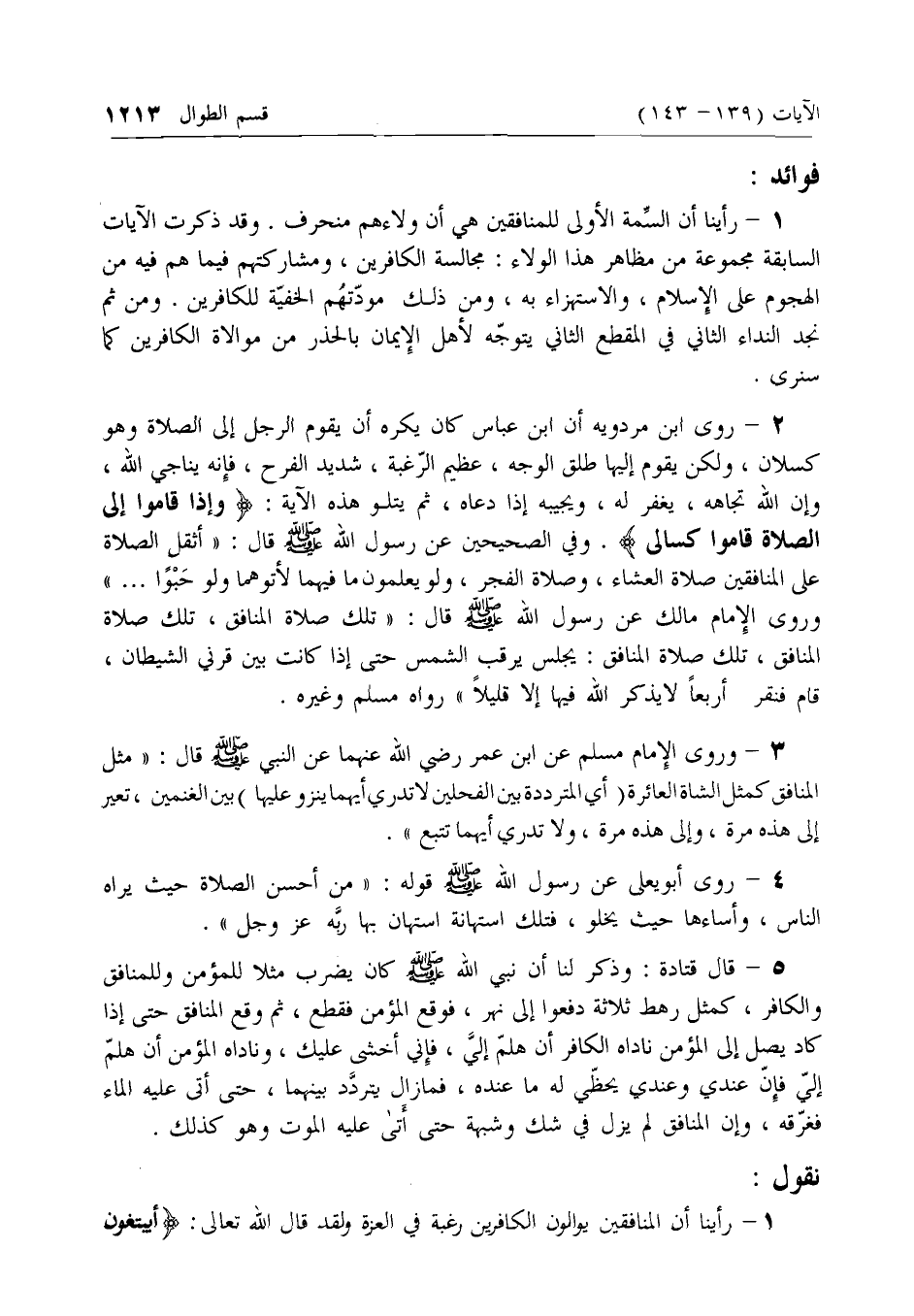 2 - روى ابن مردويه أن ابن عباس كان يكره أن يقوم الرجل إلى الصلاة وهو كسلان، ولكن يقوم إليها طلق الوجه، عظيم الرغبة، شديد الفرح، فإنه يناجي الله، وإن الله تجاهه، يغفر له، ويجيبه إذا دعاه، ثم يتلو هذه الآية: وَإِذا قامُوا إِلَى الصَّلاةِ قامُوا كُسالى. وفي الصحيحين عن رسول الله صلى الله عليه وسلم قال: «أثقل الصلاة على المنافقين صلاة العشاء، وصلاة الفجر، ولو يعلمون ما فيهما لأتوهما ولو حبوا ... » وروى الإمام مالك عن رسول الله صلى الله عليه وسلم قال: «تلك صلاة المنافق، تلك صلاة المنافق، تلك صلاة المنافق: يجلس يرقب الشمس حتى إذا كانت بين قرني الشيطان، قام فنقر أربعا لا يذكر الله فيها إلا قليلا» رواه مسلم وغيره.