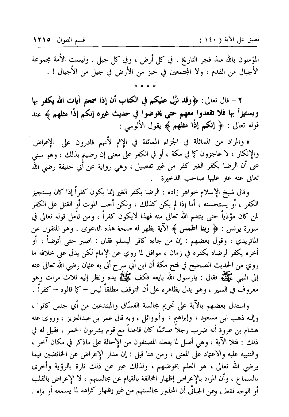 2 - قال تعالى: وَقَدْ نَزَّلَ عَلَيْكُمْ فِي الْكِتابِ أَنْ إِذا سَمِعْتُمْ آياتِ اللَّهِ يُكْفَرُ بِها وَيُسْتَهْزَأُ بِها فَلا تَقْعُدُوا مَعَهُمْ حَتَّى يَخُوضُوا فِي حَدِيثٍ غَيْرِهِ إِنَّكُمْ إِذاً مِثْلُهُمْ عند قوله تعالى: إِنَّكُمْ إِذاً مِثْلُهُمْ يقول الألوسي: