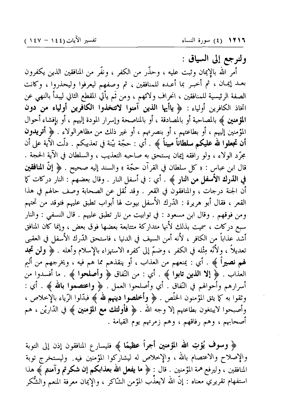 وَسَوْفَ يُؤْتِ اللَّهُ الْمُؤْمِنِينَ أَجْراً عَظِيماً فليسارع المنافقون إذن إلى التوبة والإصلاح والاعتصام بالله، والإخلاص له ليشاركوا المؤمنين فيه. وليستخرج توبة المنافقين، وليرفع همة المؤمنين.
