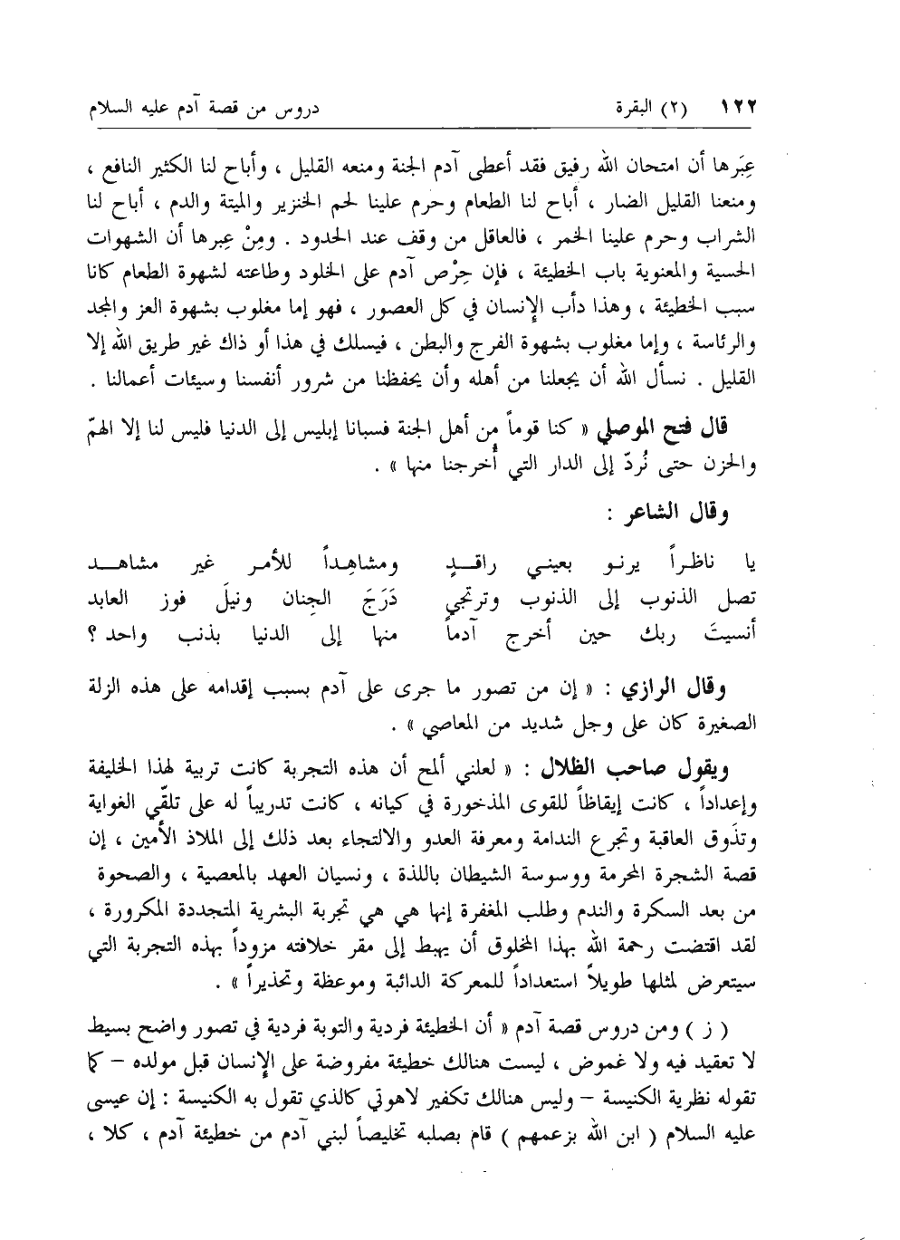 (ز) ومن دروس قصة آدم «أن الخطيئة فردية والتوبة فردية في تصور واضح بسيط لا تعقيد فيه ولا غموض، ليست هنالك خطيئة مفروضة على الإنسان قبل مولده- كما تقوله نظرية الكنيسة- وليس هنالك تكفير لاهوتي كالذي تقول به الكنيسة: إن عيسى عليه السلام (ابن الله بزعمهم) قام بصلبه تخليصا لبني آدم من خطيئة آدم، كلا،