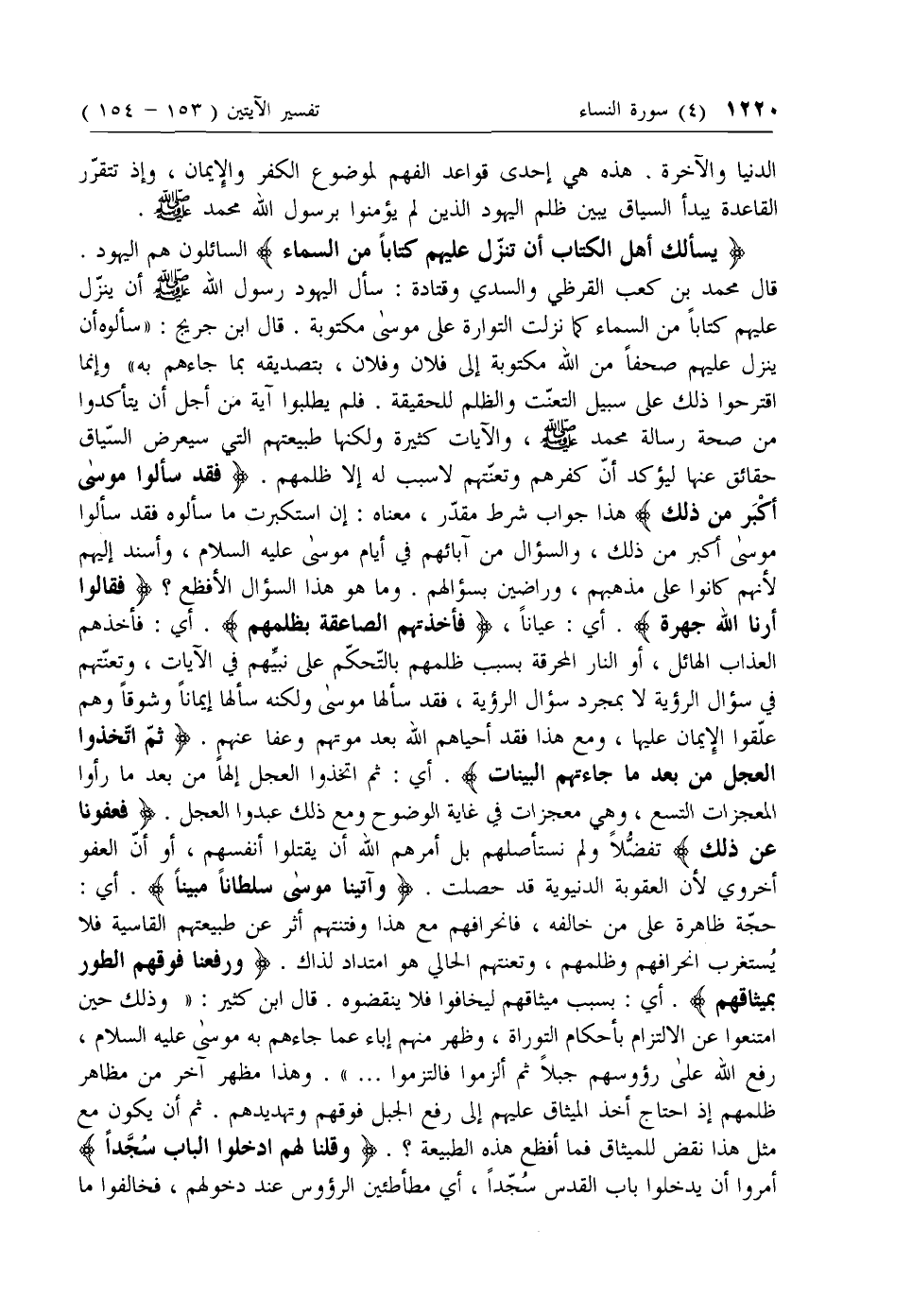 قال محمد بن كعب القرظي والسدي وقتادة: سأل اليهود رسول الله صلى الله عليه وسلم أن ينزل عليهم كتابا من السماء كما نزلت التوراة على موسى مكتوبة. قال ابن جريج: «سألوه أن ينزل عليهم صحفا من الله مكتوبة إلى فلان وفلان، بتصديقه بما جاءهم به» وإنما اقترحوا ذلك على سبيل التعنت والظلم للحقيقة. فلم يطلبوا آية من أجل أن يتأكدوا من صحة رسالة محمد صلى الله عليه وسلم، والآيات كثيرة ولكنها طبيعتهم التي سيعرض السياق حقائق عنها ليؤكد أن كفرهم وتعنتهم لا سبب له إلا ظلمهم. فَقَدْ سَأَلُوا مُوسى أَكْبَرَ مِنْ ذلِكَ هذا جواب شرط مقدر، معناه: إن استكبرت ما سألوه فقد سألوا موسى أكبر من ذلك، والسؤال من آبائهم في أيام موسى عليه السلام، وأسند إليهم لأنهم كانوا على مذهبهم، وراضين بسؤالهم. وما هو هذا السؤال الأفظع؟ فَقالُوا أَرِنَا اللَّهَ جَهْرَةً. أي: عيانا، فَأَخَذَتْهُمُ الصَّاعِقَةُ بِظُلْمِهِمْ. أي: فأخذهم العذاب الهائل، أو النار المحرقة بسبب ظلمهم بالتحكم على نبيهم في الآيات، وتعنتهم في سؤال الرؤية لا بمجرد سؤال الرؤية، فقد سألها موسى ولكنه سألها إيمانا وشوقا وهم علقوا الإيمان عليها، ومع هذا فقد أحياهم الله بعد موتهم وعفا عنهم. ثُمَّ اتَّخَذُوا الْعِجْلَ مِنْ بَعْدِ ما جاءَتْهُمُ الْبَيِّناتُ. أي: ثم اتخذوا العجل إلها من بعد ما رأوا المعجزات التسع، وهي معجزات في غاية الوضوح ومع ذلك عبدوا العجل. فَعَفَوْنا عَنْ ذلِكَ تفضلا ولم نستأصلهم بل أمرهم الله أن يقتلوا أنفسهم، أو أن العفو أخروي لأن العقوبة الدنيوية قد حصلت. وَآتَيْنا مُوسى سُلْطاناً مُبِيناً. أي: