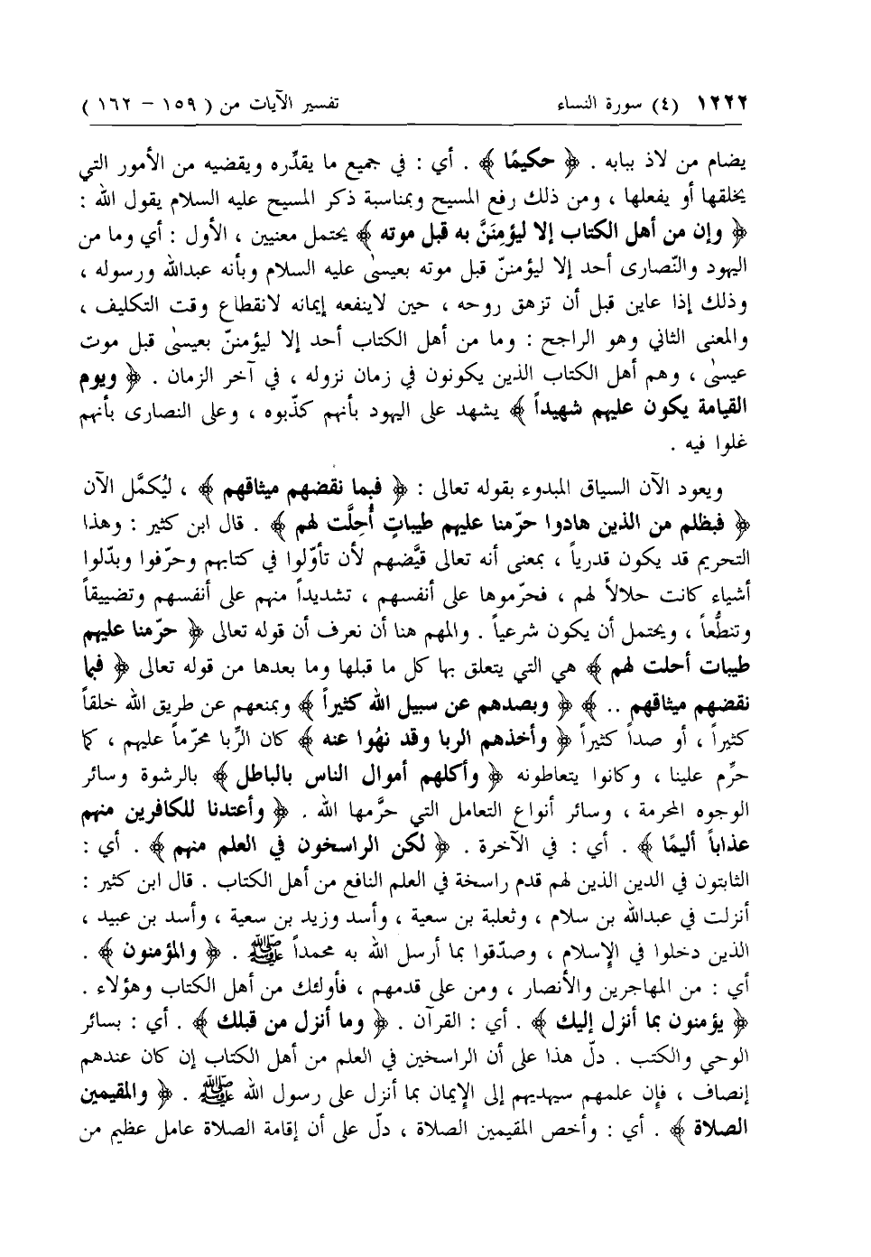 وَإِنْ مِنْ أَهْلِ الْكِتابِ إِلَّا لَيُؤْمِنَنَّ بِهِ قَبْلَ مَوْتِهِ يحتمل معنيين، الأول: أي وما من اليهود والنصارى أحد إلا ليؤمنن قبل موته بعيسى عليه السلام وبأنه عبد الله ورسوله، وذلك إذا عاين قبل أن تزهق روحه، حين لا ينفعه إيمانه لانقطاع وقت التكليف، والمعنى الثاني وهو الراجح: وما من أهل الكتاب أحد إلا ليؤمنن بعيسى قبل موت عيسى، وهم أهل الكتاب الذين يكونون في زمان نزوله، في آخر الزمان. وَيَوْمَ الْقِيامَةِ يَكُونُ عَلَيْهِمْ شَهِيداً يشهد على اليهود بأنهم كذبوه، وعلى النصارى بأنهم غلوا فيه.