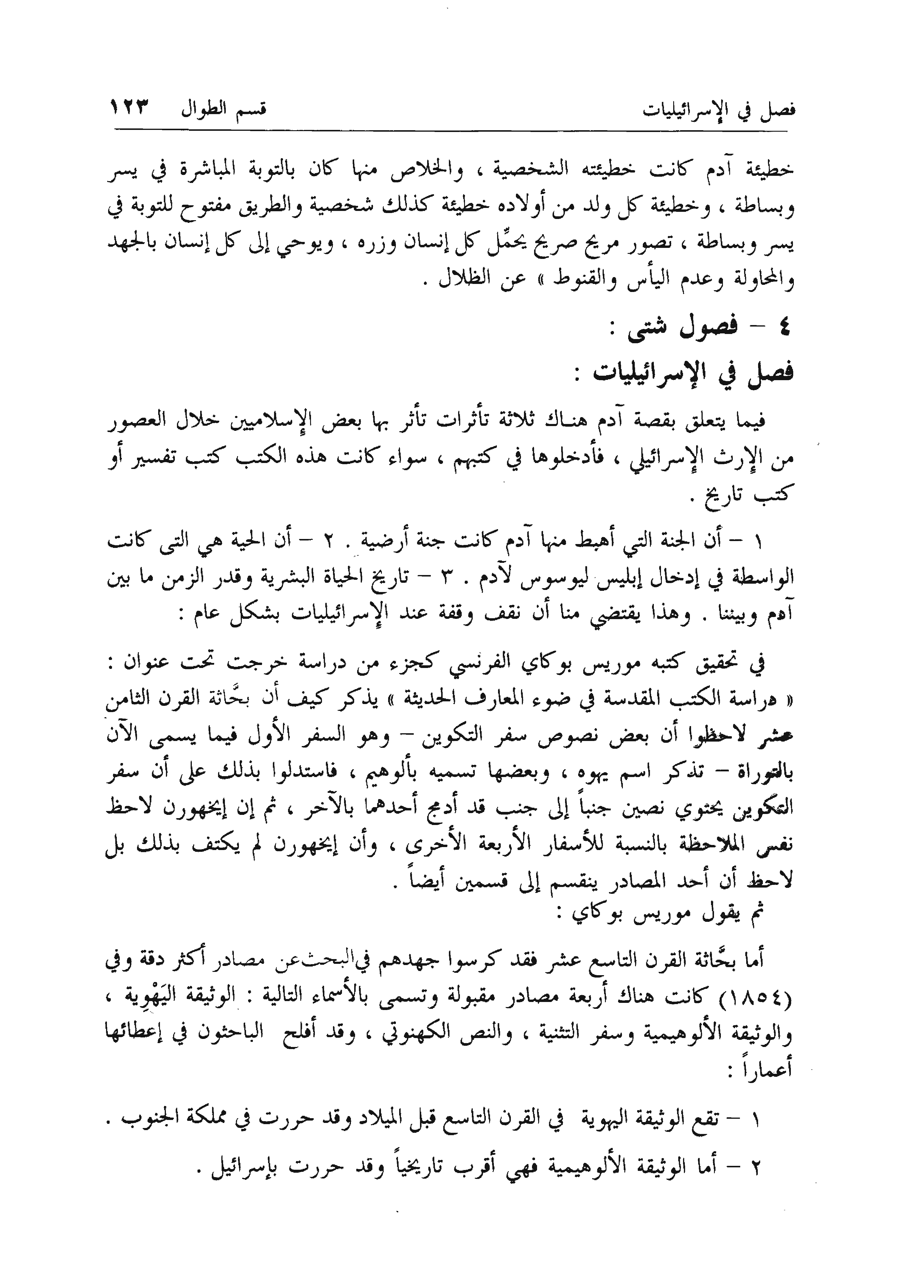 1 - أن الجنة التي أهبط منها آدم كانت جنة أرضية. 2 - أن الحية هي التى كانت الواسطة في إدخال إبليس ليوسوس لآدم. 3 - تاريخ الحياة البشرية وقدر الزمن ما بين آدم وبيننا. وهذا يقتضي منا أن نقف وقفة عند الإسرائيليات بشكل عام: