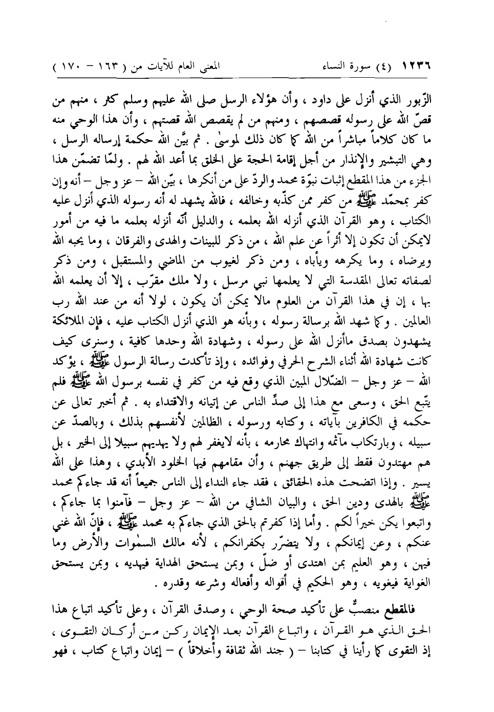 الزبور الذي أنزل على داود، وأن هؤلاء الرسل صلى الله عليهم وسلم كثر، منهم من قص الله على رسوله قصصهم، ومنهم من لم يقصص الله قصتهم، وأن هذا الوحي منه ما كان كلاما مباشرا من الله كما كان ذلك لموسى. ثم بين الله حكمة إرساله الرسل، وهي التبشير والإنذار من أجل إقامة الحجة على الخلق بما أعد الله لهم. ولما تضمن هذا الجزء من هذا المقطع إثبات نبوة محمد والرد على من أنكرها، بين الله- عزّ وجل- أنه وإن كفر بمحمد صلى الله عليه وسلم من كفر ممن كذبه وخالفه، فالله يشهد له أنه رسوله الذي أنزل عليه الكتاب، وهو القرآن الذي أنزله الله بعلمه، والدليل أنه أنزله بعلمه ما فيه من أمور لا يمكن أن تكون إلا أثرا عن علم الله، من ذكر للبينات والهدى والفرقان، وما يحبه الله ويرضاه، وما يكرهه ويأباه، ومن ذكر لغيوب من الماضي والمستقبل، ومن ذكر لصفاته تعالى المقدسة التي لا يعلمها نبي مرسل، ولا ملك مقرب، إلا أن يعلمه الله بها، إن في هذا القرآن من العلوم ما لا يمكن أن يكون، لولا أنه من عند الله رب العالمين. وكما شهد الله برسالة رسوله، وبأنه هو الذي أنزل الكتاب عليه، فإن الملائكة يشهدون بصدق ما أنزل الله على رسوله، وشهادة الله وحدها كافية، وسنرى كيف كانت شهادة الله أثناء الشرح الحرفي وفوائده، وإذ تأكدت رسالة الرسول صلى الله عليه وسلم، يؤكد الله- عزّ وجل- الضلال المبين الذي وقع فيه من كفر في نفسه برسول الله صلى الله عليه وسلم فلم يتبع الحق، وسعى مع هذا إلى صد الناس عن إتيانه والاقتداء به. ثم أخبر تعالى عن حكمه في الكافرين بآياته، وكتابه ورسوله، الظالمين لأنفسهم بذلك، وبالصد عن سبيله، وبارتكاب مآثمه وانتهاك محارمه، بأنه لا يغفر لهم ولا يهديهم سبيلا إلى الخير، بل هم مهتدون فقط إلى طريق جهنم، وأن مقامهم فيها الخلود الأبدي، وهذا على الله يسير. وإذا اتضحت هذه الحقائق، فقد جاء النداء إلى الناس جميعا أنه قد جاءكم محمد صلى الله عليه وسلم بالهدى ودين الحق، والبيان الشافي من الله- عزّ وجل- فآمنوا بما جاءكم، واتبعوا يكن خيرا لكم. وأما إذا كفرتم بالحق الذي جاءكم به محمد صلى الله عليه وسلم، فإن الله غني عنكم، وعن إيمانكم، ولا يتضرر بكفرانكم، لأنه مالك السموات والأرض وما فيهن، وهو العليم بمن اهتدى أو ضل، وبمن يستحق الهداية فيهديه، وبمن يستحق الغواية فيغويه، وهو الحكيم في أقواله وأفعاله وشرعه وقدره.