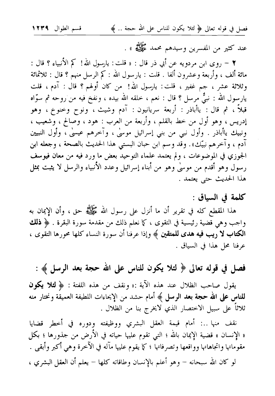فصل في قوله تعالى لِئَلَّا يَكُونَ لِلنَّاسِ عَلَى اللَّهِ حُجَّةٌ بَعْدَ الرُّسُلِ: