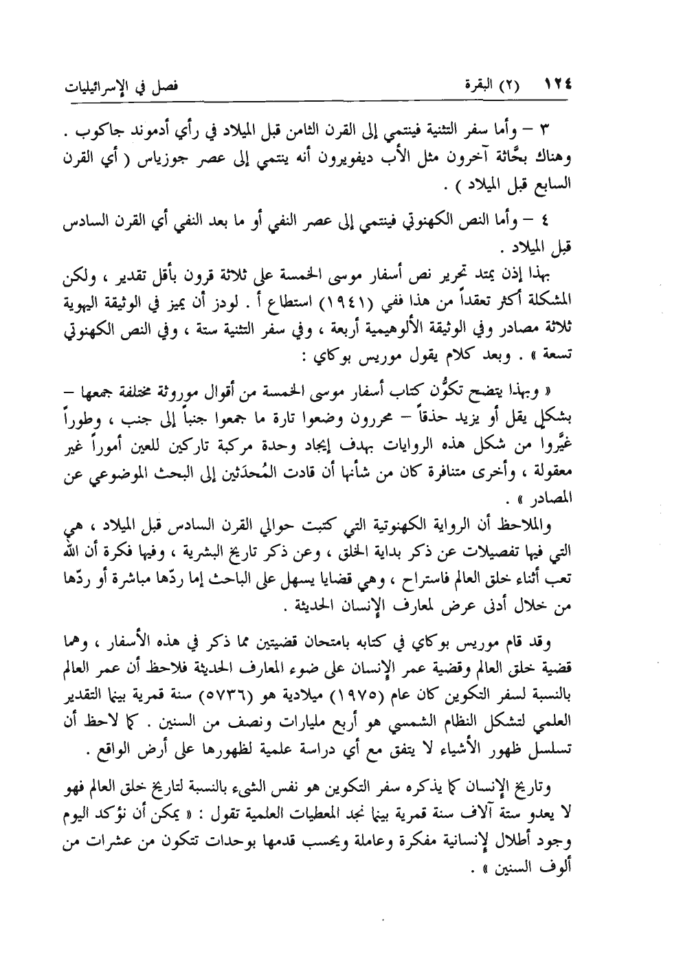 بهذا إذن يمتد تحرير نص أسفار موسى الخمسة على ثلاثة قرون بأقل تقدير، ولكن المشكلة أكثر تعقدا من هذا ففي (1941) استطاع أ. لودز أن يميز في الوثيقة اليهوية ثلاثة مصادر وفي الوثيقة الألوهيمية أربعة، وفي سفر التثنية ستة، وفي النص الكهنوتي تسعة». وبعد كلام يقول موريس بوكاي: