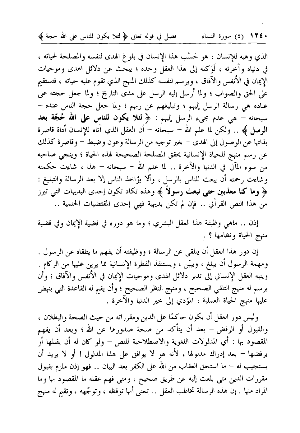 الذي وهبه للإنسان، هو حسب هذا الإنسان في بلوغ الهدى لنفسه والمصلحة لحياته، في دنياه وآخرته، لوكله إلى هذا العقل وحده؛ يبحث عن دلائل الهدى وموحيات الإيمان في الأنفس والآفاق، ويرسم لنفسه كذلك المنهج الذي تقوم عليه حياته، فتستقيم على الحق والصواب؛ ولما أرسل إليه الرسل على مدى التاريخ؛ ولما جعل حجته على عباده هي رسالة الرسل إليهم؛ وتبليغهم عن ربهم؛ ولما جعل حجة الناس عنده- سبحانه- هي عدم مجئ الرسل إليهم: لِئَلَّا يَكُونَ لِلنَّاسِ عَلَى اللَّهِ حُجَّةٌ بَعْدَ الرُّسُلِ .. ولكن لما علم الله- سبحانه- أن العقل الذي آتاه للإنسان أداة قاصرة بذاتها عن الوصول إلى الهدى- بغير توجيه من الرسالة وعون وضبط- وقاصرة كذلك عن رسم منهج للحياة الإنسانية يحقق المصلحة الصحيحة لهذه الحياة؛ وينجي صاحبه من سوء المآل في الدنيا والآخرة .. لما علم الله- سبحانه- هذا، شاءت حكمته وشاءت رحمته أن يبعث للناس بالرسل، وألا يؤاخذ الناس إلا بعد الرسالة والتبليغ: