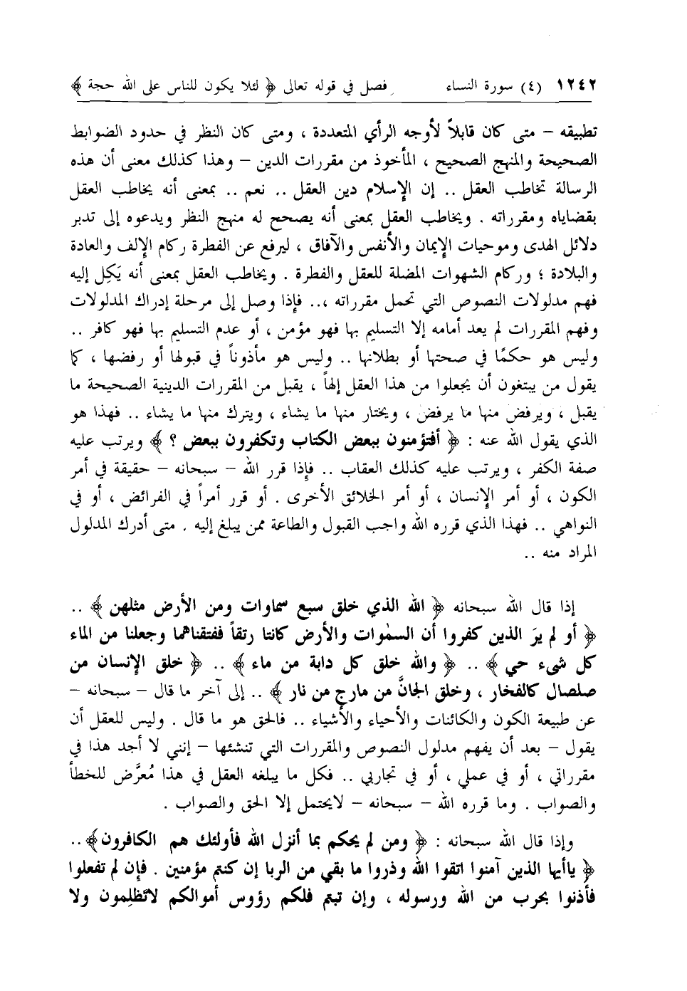 وليس هو حكما في صحتها أو بطلانها .. وليس هو مأذونا في قبولها أو رفضها، كما يقول من يبتغون أن يجعلوا من هذا العقل إلها، يقبل من المقررات الدينية الصحيحة ما يقبل، ويرفض منها ما يرفض، ويختار منها ما يشاء، ويترك منها ما يشاء .. فهذا هو الذي يقول الله عنه: أَفَتُؤْمِنُونَ بِبَعْضِ الْكِتابِ وَتَكْفُرُونَ بِبَعْضٍ؟ ويرتب عليه صفة الكفر، ويرتب عليه كذلك العقاب .. فإذا قرر الله- سبحانه- حقيقة في أمر الكون، أو أمر الإنسان، أو أمر الخلائق الأخرى. أو قرر أمرا في الفرائض، أو في النواهي .. فهذا الذي قرره الله واجب القبول والطاعة ممن يبلغ إليه. متى أدرك المدلول المراد منه ..