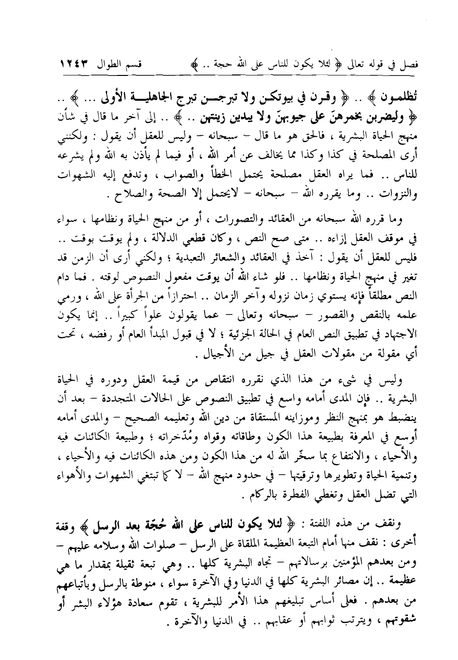 وَلْيَضْرِبْنَ بِخُمُرِهِنَّ عَلى جُيُوبِهِنَّ وَلا يُبْدِينَ زِينَتَهُنَّ .... إلى آخر ما قال في شأن منهج الحياة البشرية، فالحق هو ما قال- سبحانه- وليس للعقل أن يقول: ولكنني أرى المصلحة في كذا وكذا مما يخالف عن أمر الله، أو فيما لم يأذن به الله ولم يشرعه للناس .. فما يراه العقل مصلحة يحتمل الخطأ والصواب، وتدفع إليه الشهوات والنزوات .. وما يقرره الله- سبحانه- لا يحتمل إلا الصحة والصلاح.
