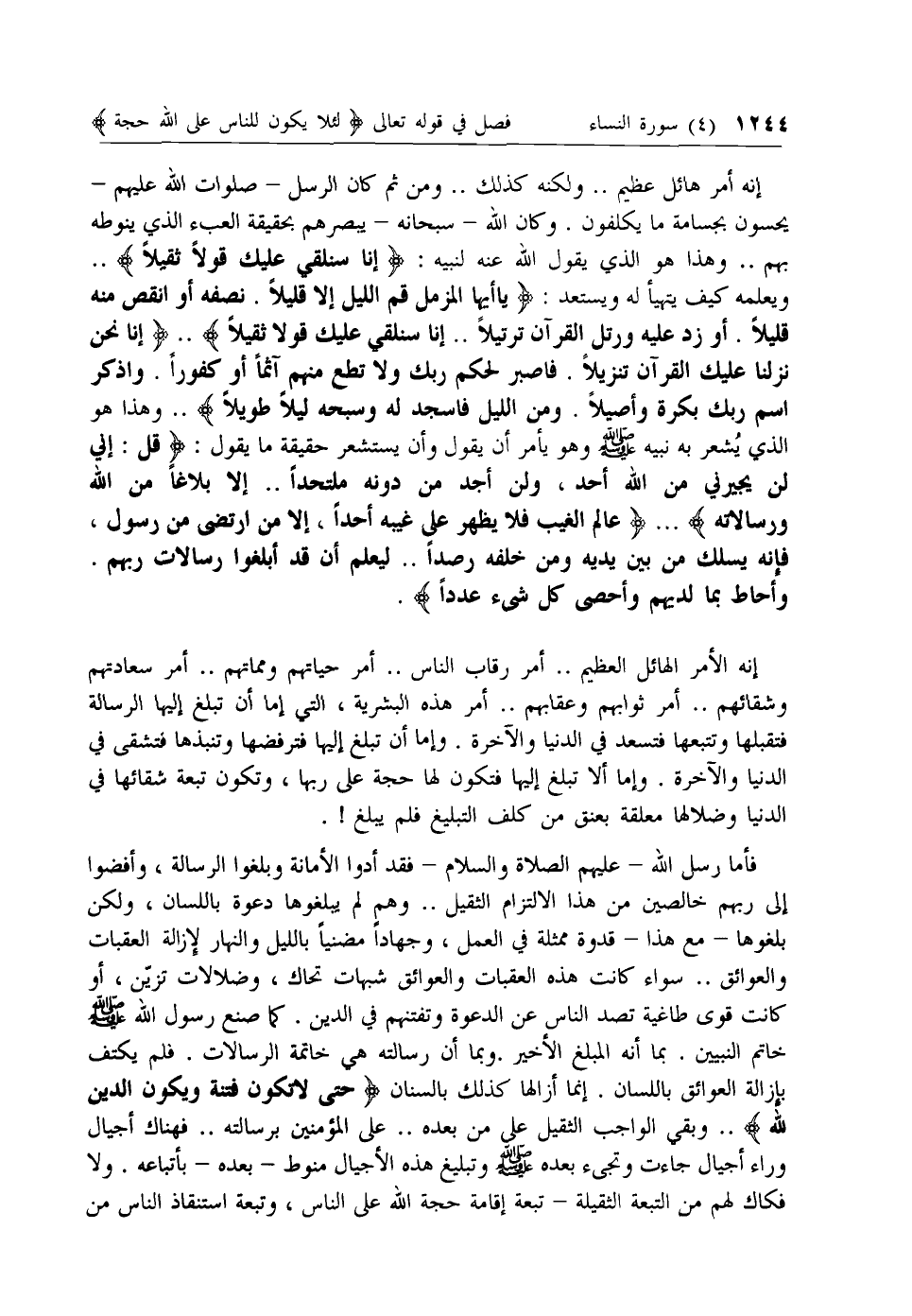إنه أمر هائل عظيم .. ولكنه كذلك .. ومن ثم كان الرسل- صلوات الله عليهم- يحسون بجسامة ما يكلفون. وكان الله- سبحانه- يبصرهم بحقيقة العبء الذي ينوطه بهم .. وهذا هو الذي يقول الله عنه لنبيه: إِنَّا سَنُلْقِي عَلَيْكَ قَوْلًا ثَقِيلًا ..