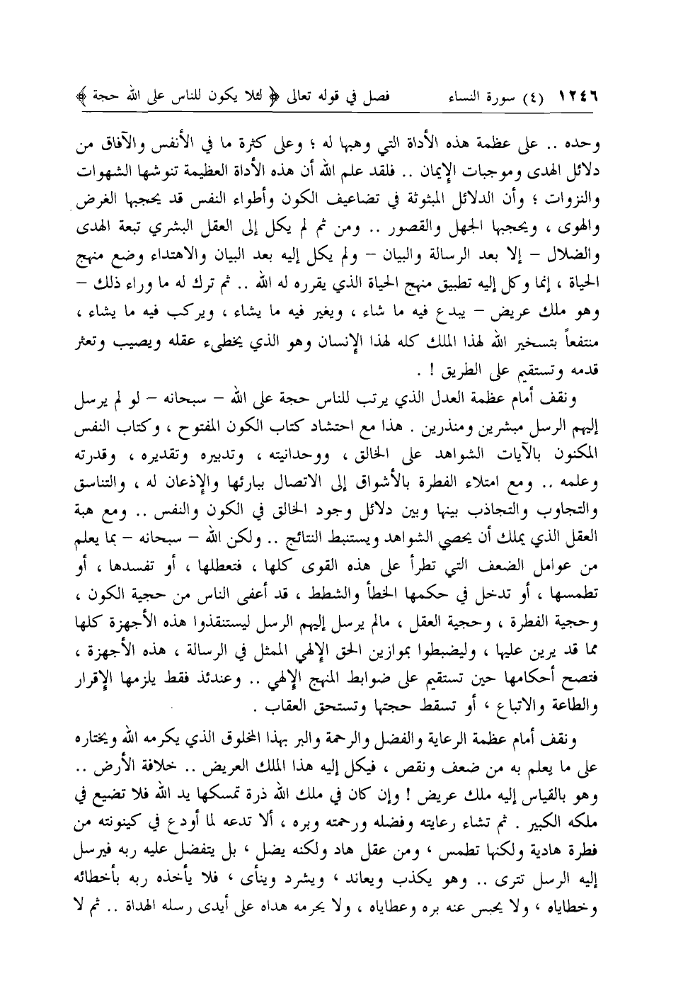 ونقف أمام عظمة العدل الذي يرتب للناس حجة على الله- سبحانه- لو لم يرسل إليهم الرسل مبشرين ومنذرين. هذا مع احتشاد كتاب الكون المفتوح، وكتاب النفس المكنون بالآيات الشواهد على الخالق، ووحدانيته، وتدبيره وتقديره، وقدرته وعلمه .. ومع امتلاء الفطرة بالأشواق إلى الاتصال ببارئها والإذعان له، والتناسق والتجاوب والتجاذب بينها وبين دلائل وجود الخالق في الكون والنفس .. ومع هبة العقل الذي يملك أن يحصي الشواهد ويستنبط النتائج .. ولكن الله- سبحانه- بما يعلم من عوامل الضعف التي تطرأ على هذه القوى كلها، فتعطلها، أو تفسدها، أو تطمسها، أو تدخل في حكمها الخطأ والشطط، قد أعفى الناس من حجية الكون، وحجية الفطرة، وحجية العقل، ما لم يرسل إليهم الرسل ليستنقذوا هذه الأجهزة كلها مما قد يرين عليها، وليضبطوا بموازين الحق الإلهي الممثل في الرسالة، هذه الأجهزة، فتصح أحكامها حين تستقيم على ضوابط المنهج الإلهي .. وعندئذ فقط يلزمها الإقرار والطاعة والاتباع، أو تسقط حجتها وتستحق العقاب.