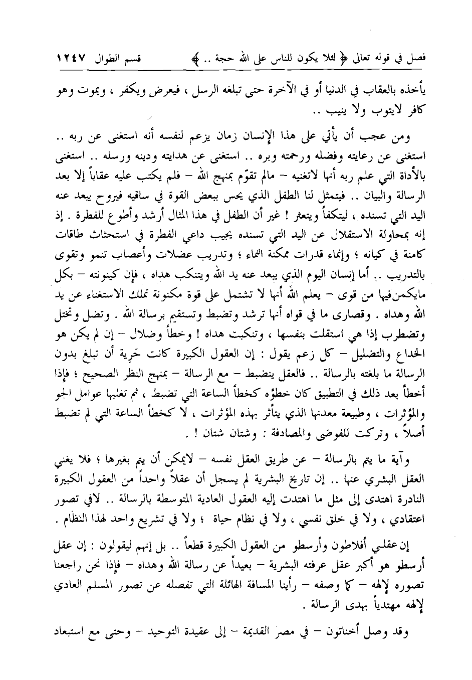 استغنى عن رعايته وفضله ورحمته وبره .. استغنى عن هدايته ودينه ورسله .. استغنى بالأداة التي علم ربه أنها لا تغنيه- ما لم تقوم بمنهج الله- فلم يكتب عليه عقابا إلا بعد الرسالة والبيان .. فيتمثل لنا الطفل الذي يحس ببعض القوة في ساقيه فيروح يبعد عنه اليد التي تسنده، ليتكفأ ويتعثر! غير أن الطفل في هذا المثال أرشد وأطوع للفطرة. إذ إنه بمحاولة الاستقلال عن اليد التي تسنده يجيب داعي الفطرة في استحثاث طاقات كامنة في كيانه؛ وإنماء قدرات ممكنة النماء؛ وتدريب عضلات وأعصاب تنمو وتقوى بالتدريب .. أما إنسان اليوم الذي يبعد عنه يد الله ويتنكب هداه، فإن كينونته- بكل ما يكمن فيها من قوى- يعلم الله أنها لا تشتمل على قوة مكنونة تملك الاستغناء عن يد الله وهداه. وقصارى ما في قواه أنها ترشد وتضبط وتستقيم برسالة الله. وتضل وتختل وتضطرب إذا هي استقلت بنفسها، وتنكبت هداه! وخطأ وضلال- إن لم يكن هو الخداع والتضليل- كل زعم يقول: إن العقول الكبيرة كانت حرية أن تبلغ بدون الرسالة ما بلغته بالرسالة .. فالعقل ينضبط- مع الرسالة- بمنهج النظر الصحيح؛ فإذا أخطأ بعد ذلك في التطبيق كان خطؤه كخطإ الساعة التي تضبط، ثم تغلبها عوامل الجو والمؤثرات، وطبيعة معدنها الذي يتأثر بهذه المؤثرات، لا كخطإ الساعة التي لم تضبط أصلا، وتركت للفوضى والمصادفة: وشتان شتان!.