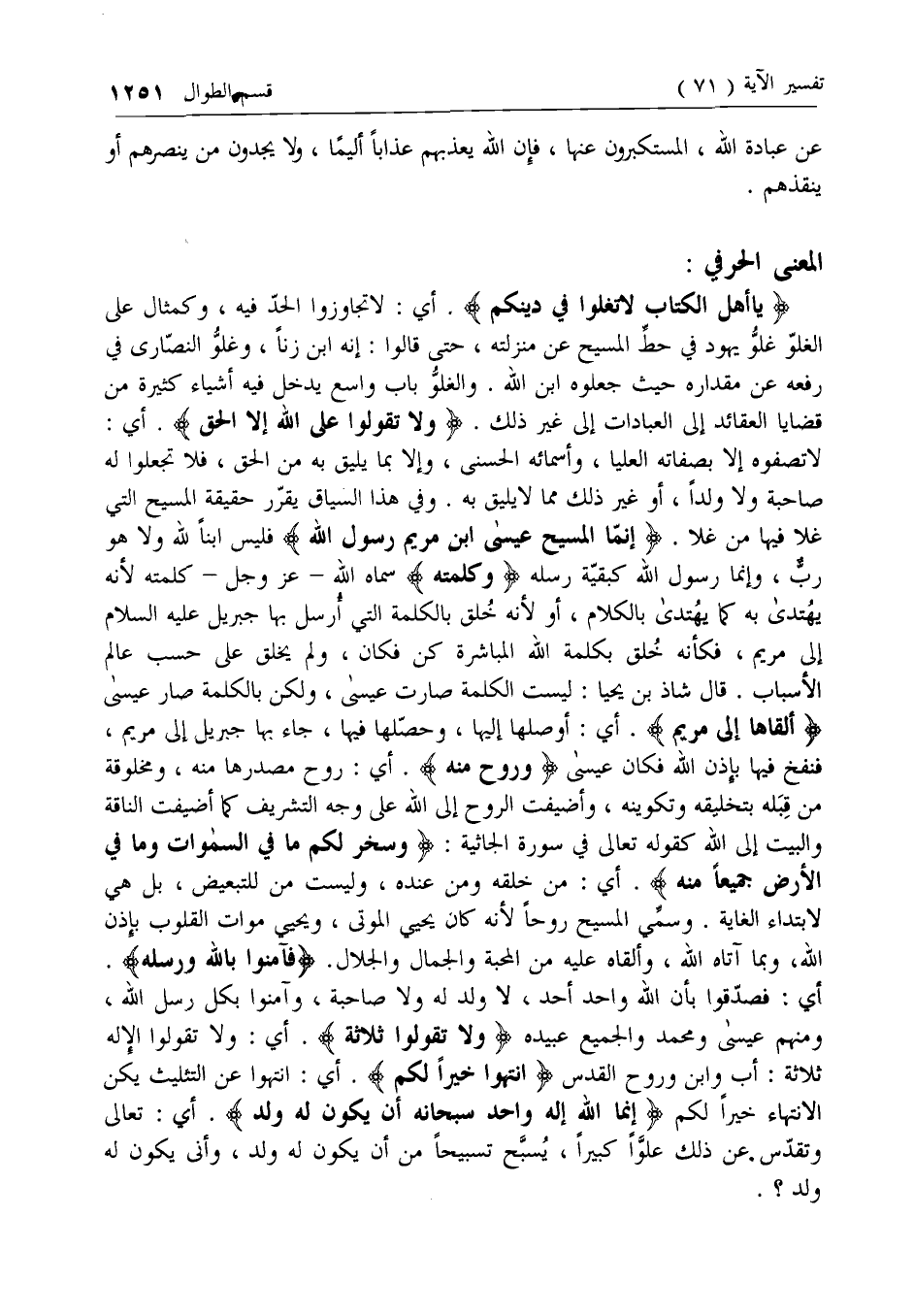 لا تصفوه إلا بصفاته العليا، وأسمائه الحسنى، وإلا بما يليق به من الحق، فلا تجعلوا له صاحبة ولا ولدا، أو غير ذلك مما لا يليق به. وفي هذا السياق يقرر حقيقة المسيح التي غلا فيها من غلا. إِنَّمَا الْمَسِيحُ عِيسَى ابْنُ مَرْيَمَ رَسُولُ اللَّهِ فليس ابنا لله ولا هو رب، وإنما رسول الله كبقية رسله وَكَلِمَتُهُ سماه الله- عزّ وجل- كلمته لأنه يهتدى به كما يهتدى بالكلام، أو لأنه خلق بالكلمة التي أرسل بها جبريل عليه السلام إلى مريم، فكأنه خلق بكلمة الله المباشرة كن فكان، ولم يخلق على حسب عالم الأسباب. قال شاذ بن يحيا: ليست الكلمة صارت عيسى، ولكن بالكلمة صار عيسى أَلْقاها إِلى مَرْيَمَ. أي: أوصلها إليها، وحصلها فيها، جاء بها جبريل إلى مريم، فنفخ فيها بإذن الله فكان عيسى وَرُوحٌ مِنْهُ. أي: روح مصدرها منه، ومخلوقة من قبله بتخليقه وتكوينه، وأضيفت الروح إلى الله على وجه التشريف كما أضيفت الناقة والبيت إلى الله كقوله تعالى في سورة الجاثية: وَسَخَّرَ لَكُمْ ما فِي السَّماواتِ وَما فِي الْأَرْضِ جَمِيعاً مِنْهُ. أي: من خلقه ومن عنده، وليست من للتبعيض، بل هي لابتداء الغاية. وسمي المسيح روحا لأنه كان يحيي الموتى، ويحيي موات القلوب بإذن الله، وبما آتاه الله، وألقاه عليه من المحبة والجمال والجلال. فَآمِنُوا بِاللَّهِ وَرُسُلِهِ.