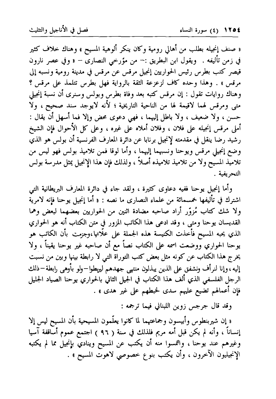 وأما إنجيل يوحنا ففيه دعاوى كثيرة، ولقد جاء في دائرة المعارف البريطانية التي اشترك في تأليفها خمسمائة من علماء النصارى ما نصه: «أما إنجيل يوحنا فإنه لا مرية ولا شك كتاب مزور أراد صاحبه مضادة اثنين من الحواريين بعضهما لبعض وهما القديسان يوحنا ومتى، وقد ادعى هذا الكاتب المزور في متن الكتاب أنه هو الحواري الذي يحبه المسيح فأخذت الكنيسة هذه الجملة على علاتها، وجزمت بأن الكاتب هو يوحنا الحواري ووضعت اسمه على الكتاب نصا مع أن صاحبه غير يوحنا يقينا، ولا يخرج هذا الكتاب عن كونه مثل بعض كتب التوراة التي لا رابطة بينها وبين من نسبت إليه، وإنا لنرأف ونشفق على الذين يبذلون منتهى جهدهم ليربطوا- ولو بأوهى رابطة- ذلك الرجل الفلسفي الذي ألف هذا الكتاب في الجيل الثاني بالحواري يوحنا الصياد الجليل فإن أعمالهم تضيع عليهم سدى لخبطهم على غير هدى».