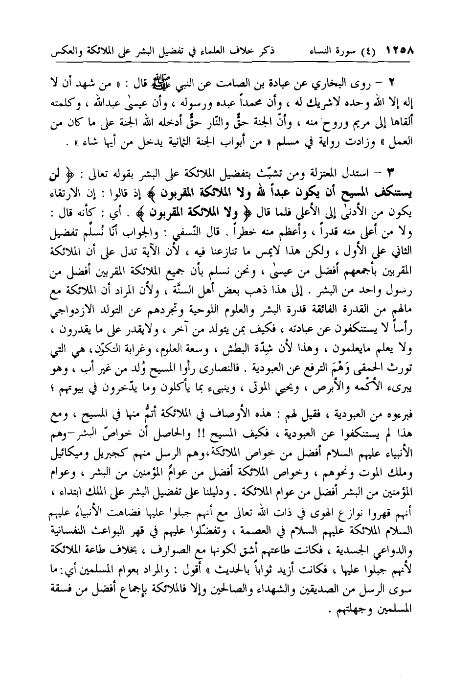 3 - استدل المعتزلة ومن تشبث بتفضيل الملائكة على البشر بقوله تعالى: لَنْ يَسْتَنْكِفَ الْمَسِيحُ أَنْ يَكُونَ عَبْداً لِلَّهِ وَلَا الْمَلائِكَةُ الْمُقَرَّبُونَ إذ قالوا: إن الارتقاء يكون من الأدنى إلى الأعلى فلما قال وَلَا الْمَلائِكَةُ الْمُقَرَّبُونَ. أي: كأنه قال: