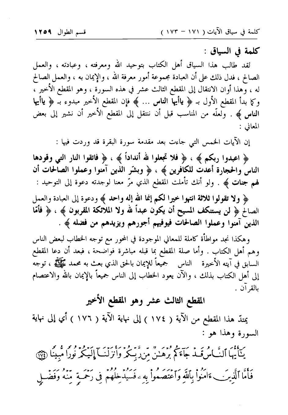 لقد طالب هذا السياق أهل الكتاب بتوحيد الله ومعرفته، وعبادته، والعمل الصالح، فدل ذلك على أن العبادة مجموعة أمور معرفة الله، والإيمان به، والعمل الصالح له، وهذا أوان الانتقال إلى المقطع الثالث عشر في هذه السورة، وهو المقطع الأخير، وكما بدأ المقطع الأول ب يا أَيُّهَا النَّاسُ ... فإن المقطع الأخير مبدوء ب يا أَيُّهَا النَّاسُ. ولعله من المناسب قبل أن ننتقل إلى المقطع الأخير أن نشير إلى بعض المعاني: