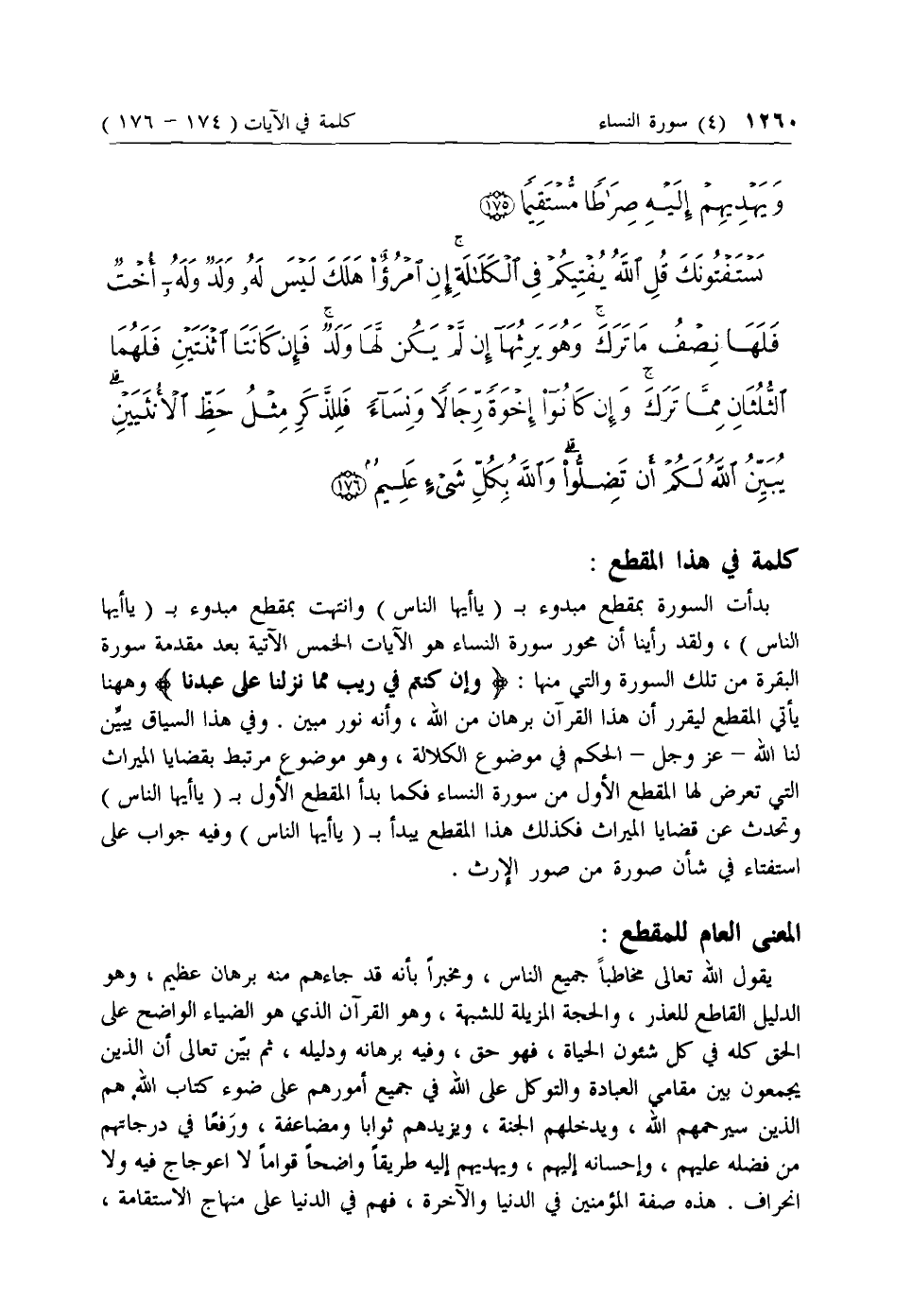 بدأت السورة بمقطع مبدوء ب (يا أيها الناس) وانتهت بمقطع مبدوء ب (يا أيها الناس)، ولقد رأينا أن محور سورة النساء هو الآيات الخمس الآتية بعد مقدمة سورة البقرة من تلك السورة والتي منها: وَإِنْ كُنْتُمْ فِي رَيْبٍ مِمَّا نَزَّلْنا عَلى عَبْدِنا وهاهنا يأتي المقطع ليقرر أن هذا القرآن برهان من الله، وأنه نور مبين. وفي هذا السياق يبين لنا الله- عزّ وجل- الحكم في موضوع الكلالة، وهو موضوع مرتبط بقضايا الميراث التي تعرض لها المقطع الأول من سورة النساء فكما بدأ المقطع الأول ب (يا أيها الناس) وتحدث عن قضايا الميراث فكذلك هذا المقطع يبدأ ب (يا أيها الناس) وفيه جواب على استفتاء في شأن صورة من صور الإرث.
