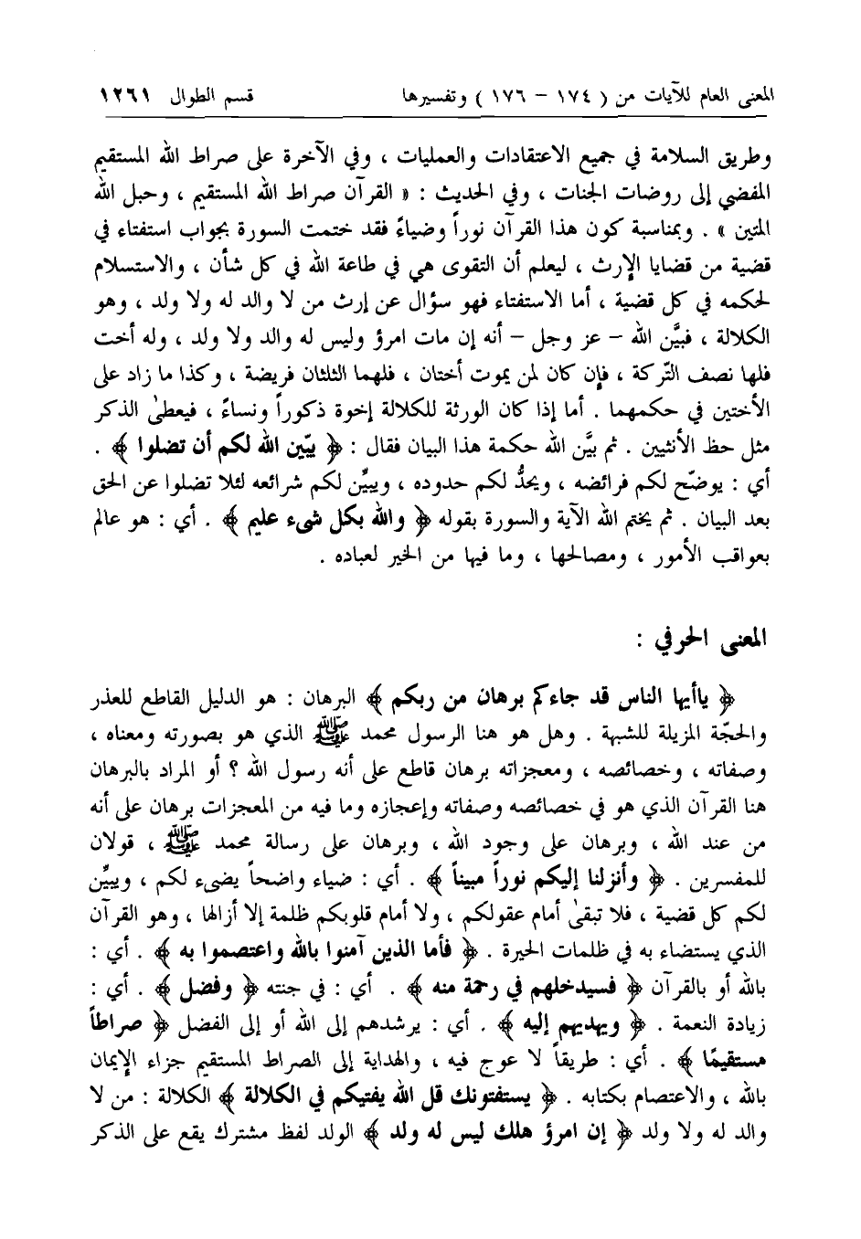 وطريق السلامة في جميع الاعتقادات والعمليات، وفي الآخرة على صراط الله المستقيم المفضي إلى روضات الجنات، وفي الحديث: «القرآن صراط الله المستقيم، وحبل الله المتين». وبمناسبة كون هذا القرآن نورا وضياء فقد ختمت السورة بجواب استفتاء في قضية من قضايا الإرث، ليعلم أن التقوى هي في طاعة الله في كل شأن، والاستسلام لحكمه في كل قضية، أما الاستفتاء فهو سؤال عن إرث من لا والد له ولا ولد، وهو الكلالة، فبين الله- عزّ وجل- أنه إن مات امرؤ وليس له والد ولا ولد، وله أخت فلها نصف التركة، فإن كان لمن يموت أختان، فلهما الثلثان فريضة، وكذا ما زاد على الأختين في حكمهما. أما إذا كان الورثة للكلالة إخوة ذكورا ونساء، فيعطى الذكر مثل حظ الأنثيين. ثم بين الله حكمة هذا البيان فقال: يُبَيِّنُ اللَّهُ لَكُمْ أَنْ تَضِلُّوا.