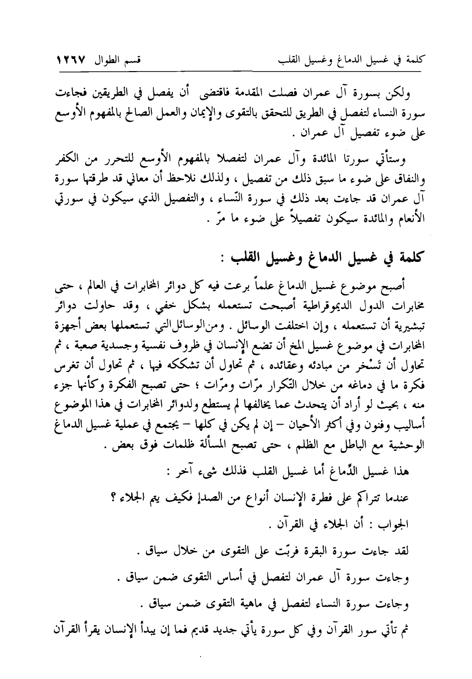 ولكن بسورة آل عمران فصلت المقدمة فاقتضى أن يفصل في الطريقين فجاءت سورة النساء لتفصل في الطريق للتحقق بالتقوى والإيمان والعمل الصالح بالمفهوم الأوسع على ضوء تفصيل آل عمران.